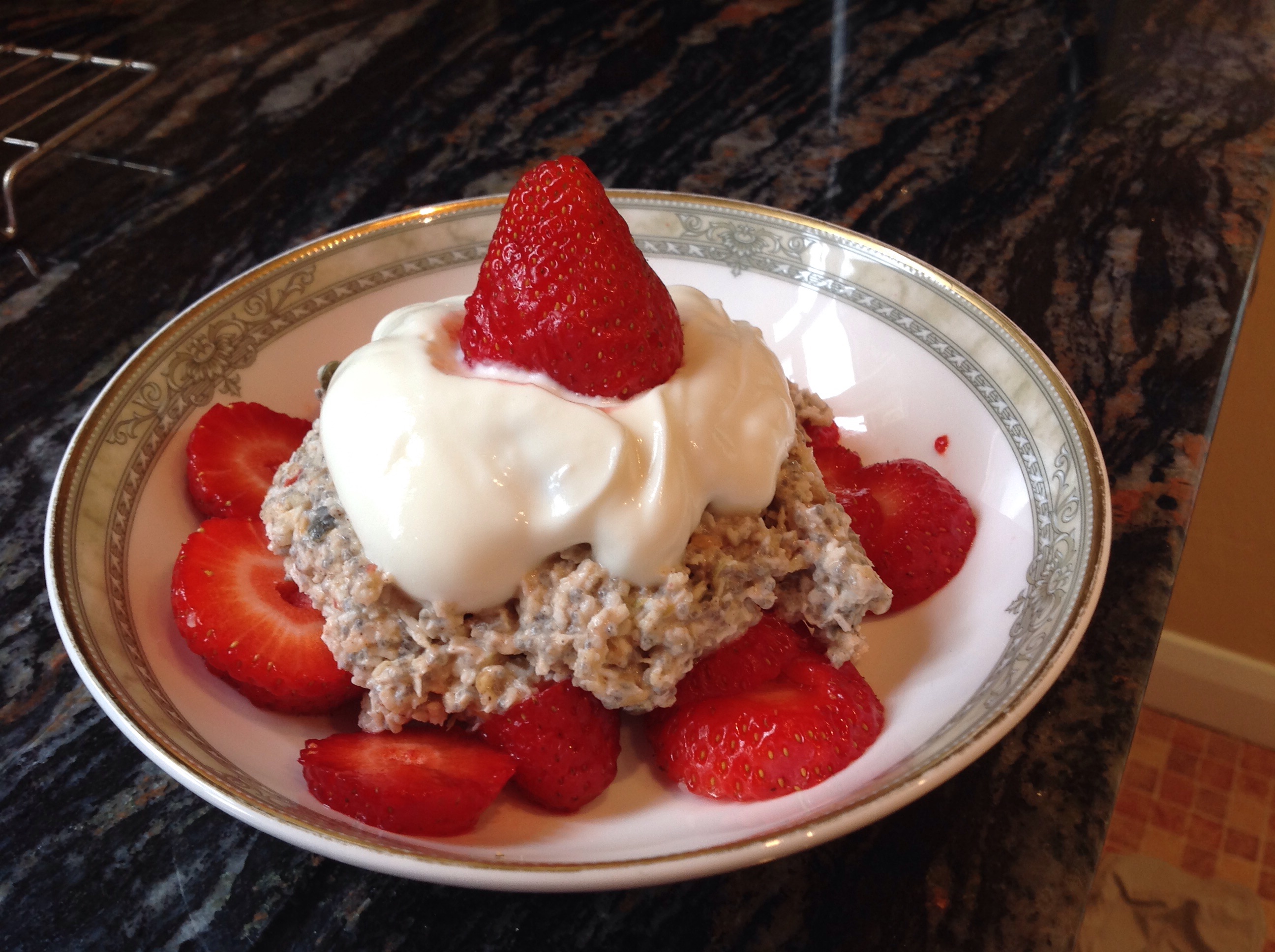 Although this is strictly speaking a breakfast dish, my husband will eat a bowlful at any time if he spots it in the fridge. The last time I made it, instead of strawberries, I stirred in some frozen mixed berries and it was delicious.
