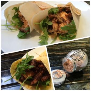 To make the wraps – toss left-over chicken in some fajita seasoning and fry quickly in coconut oil until hot and crispy. Warm the wraps; pile up rocket, slaw and chicken and fold up using a cocktail stick to secure. The gingery carrot slaw really seems to bring out the flavours of the spicy chicken and peppery rocket. Enjoy!