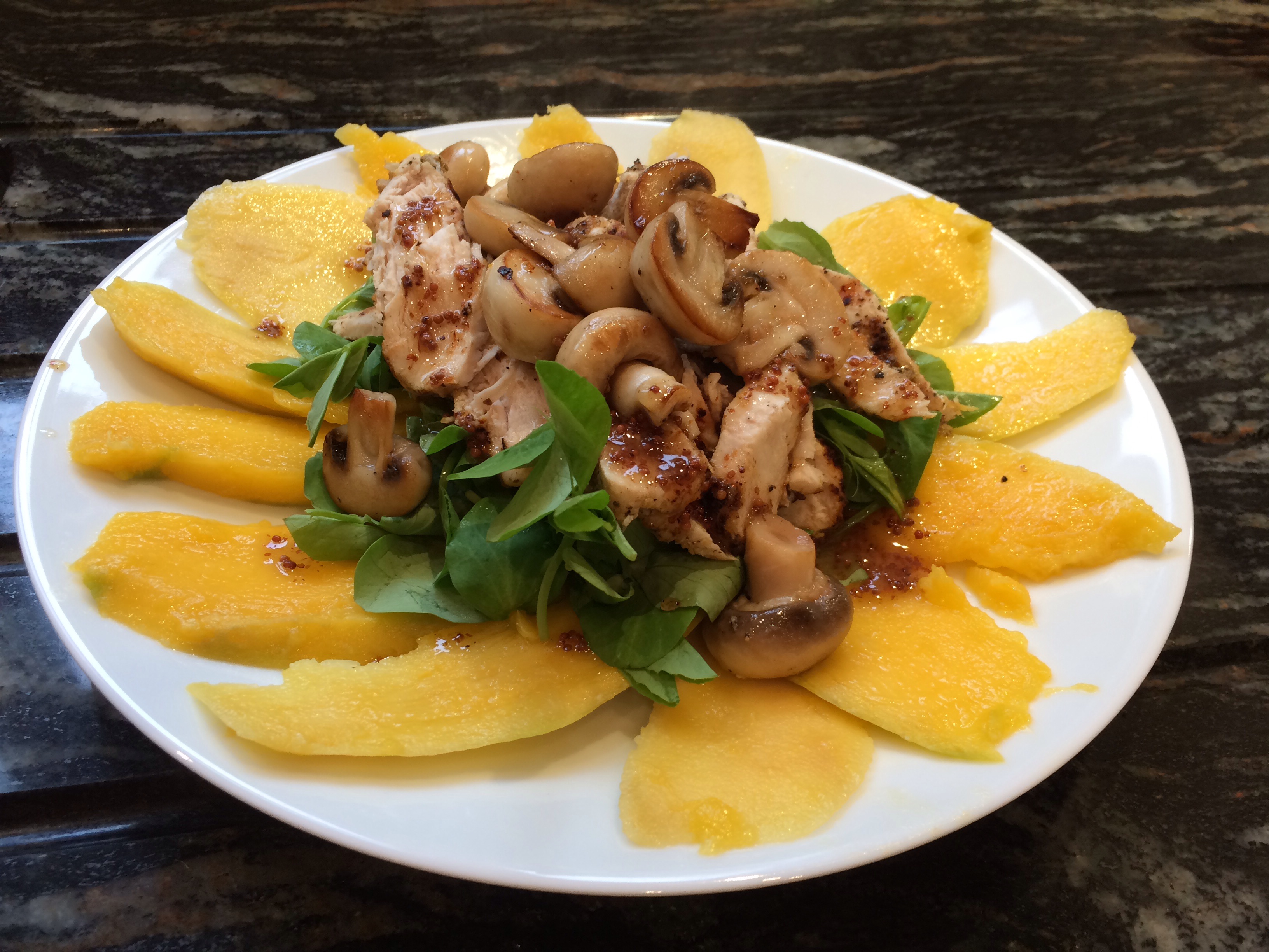 This is such a lovely sunny dish that it always brings a smile to my face when seeing it. The delicious flavours of chicken and mango really go well together and the addition of a little honey/mustard dressing adds that extra zing. This recipe serves two people but can easily be increased for more.