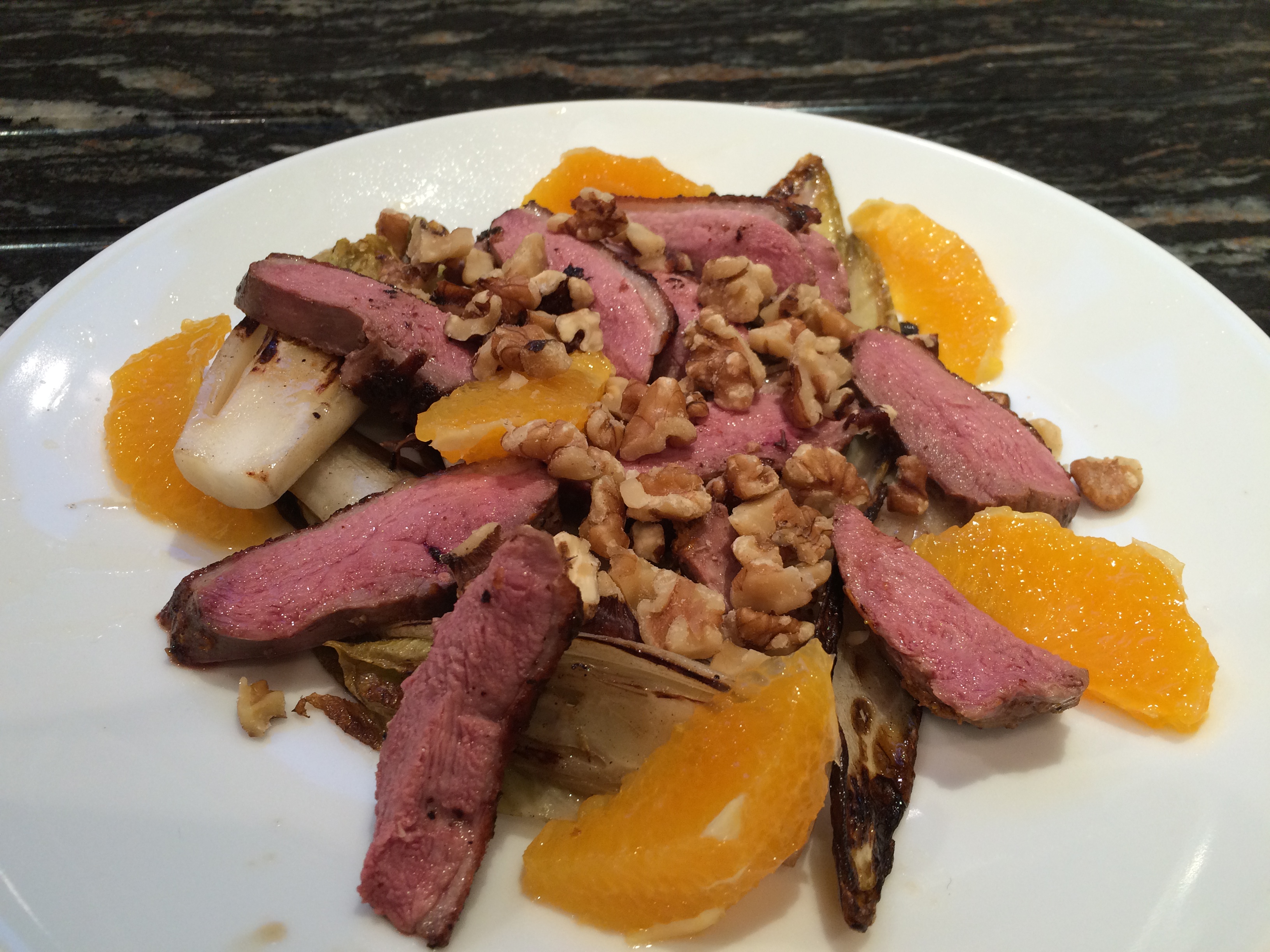 Serve the duck with the sliced orange, charred chicory, figs and walnuts and a drizzle of olive oil.