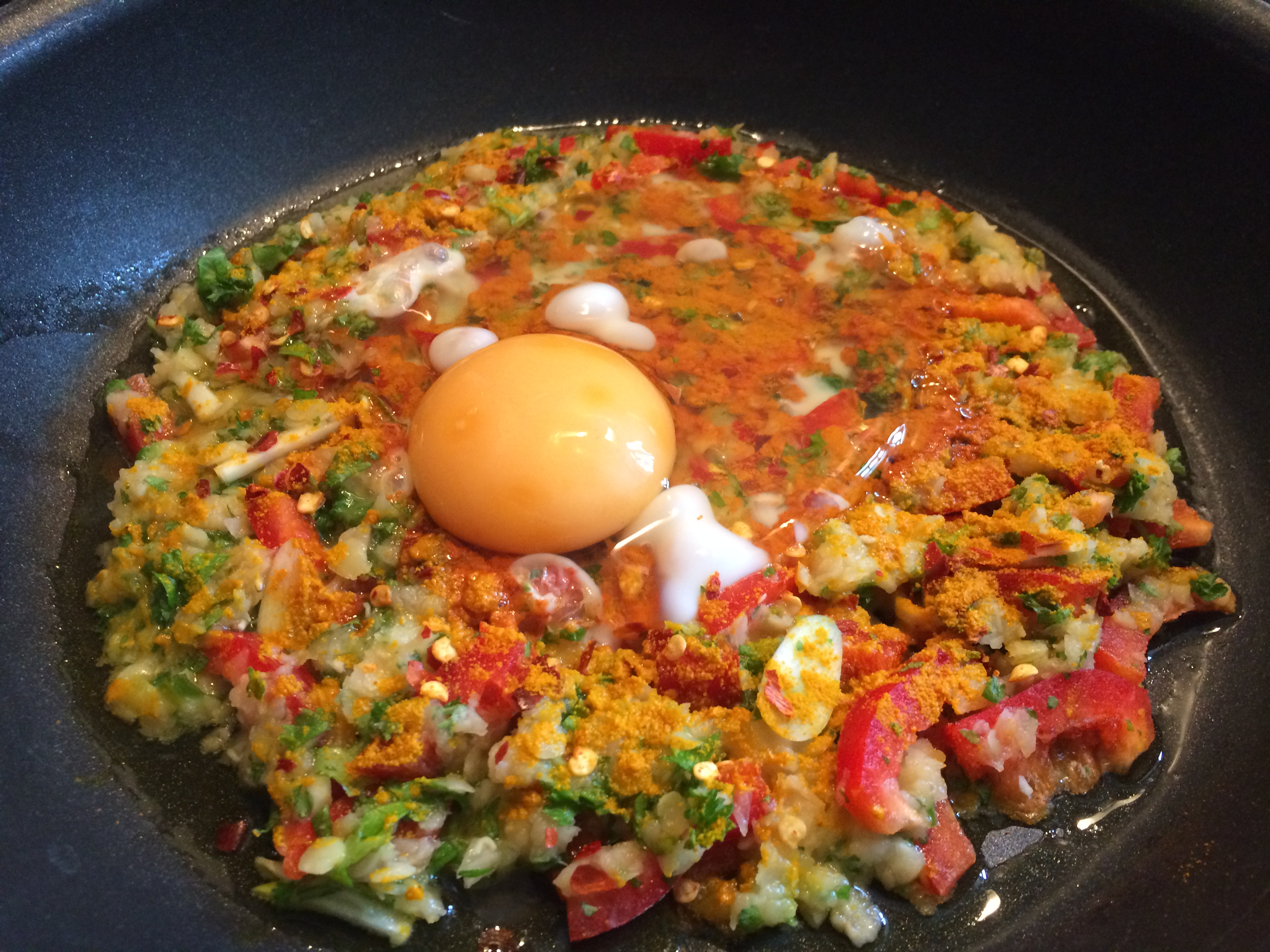 Heat a little olive oil in a fry pan and add the mixture to the pan, smoothing down to form a pancake. Sprinkle the turmeric, chilli flakes, salt and pepper over the top of the pancake.