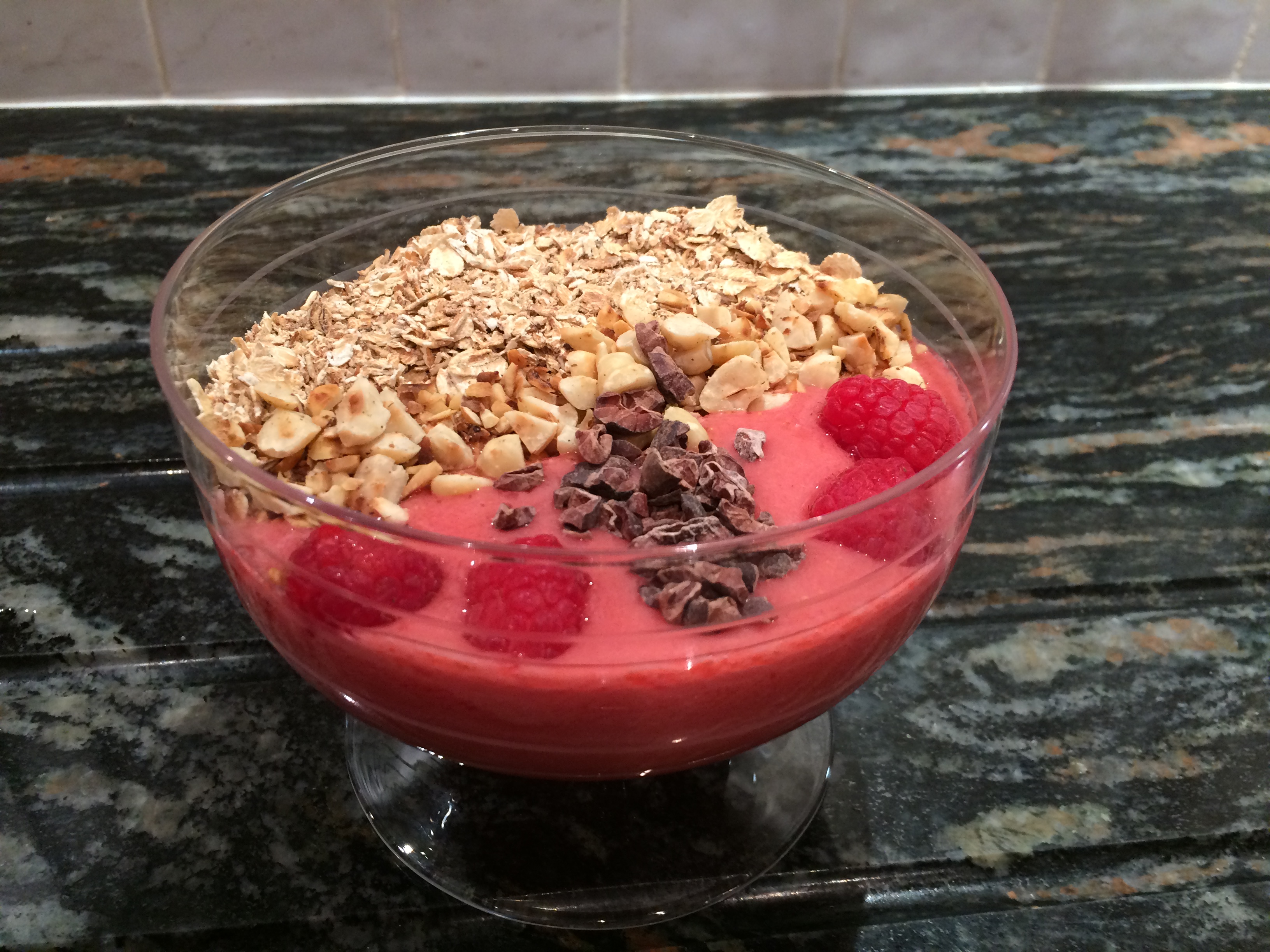 Pour the smoothie into a bowl for serving and decorate with a few more raspberries, some blueberries (optional), the toasted oats and nuts and the cacao nibs.
