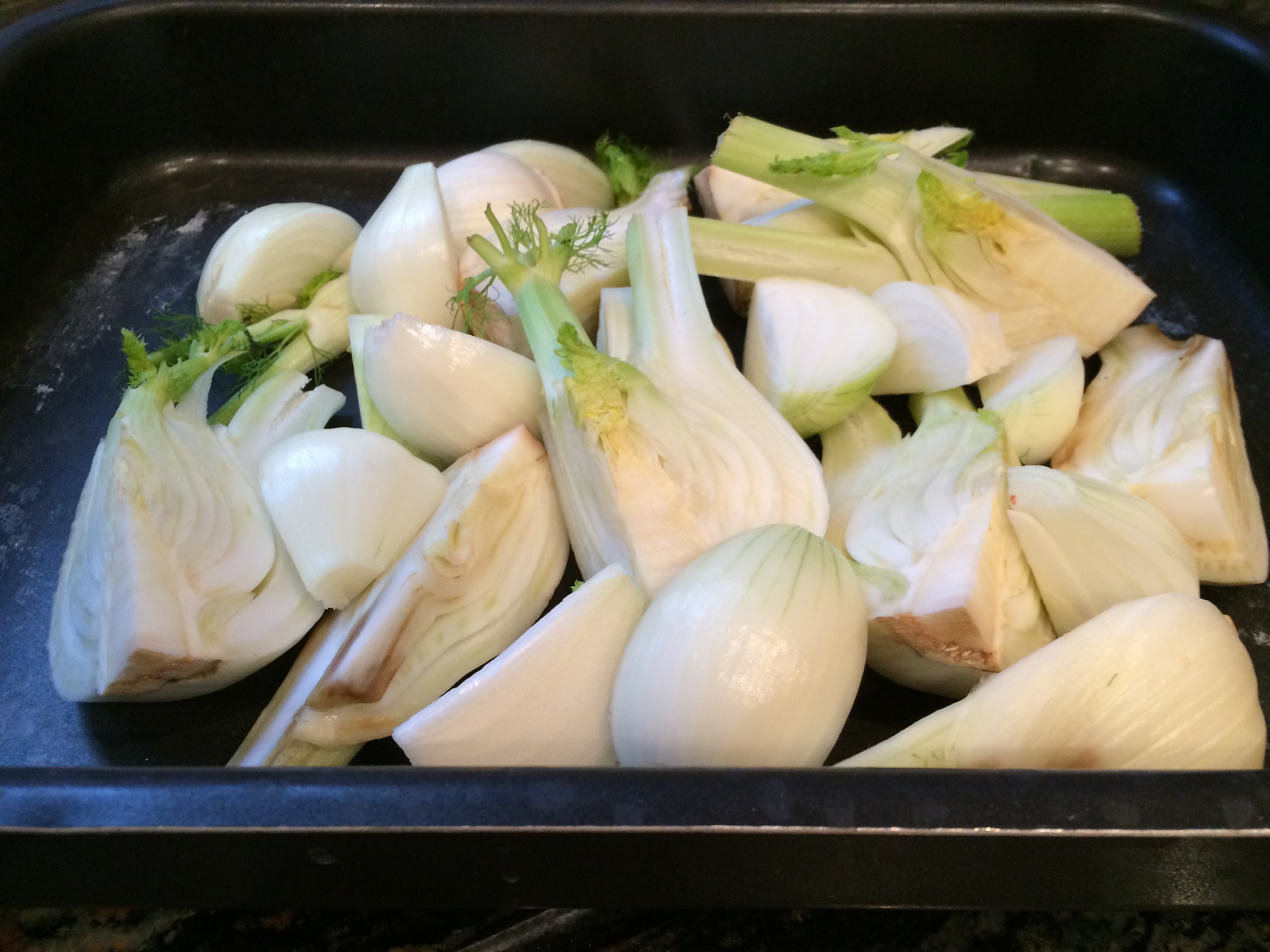 Remove the fennel and onion from the roasting tin and chop to a ‘salsa’ consistency and put in a bowl with the white wine vinegar, chillies and herbs. Give the mixture a good stir and season to taste with salt and pepper.