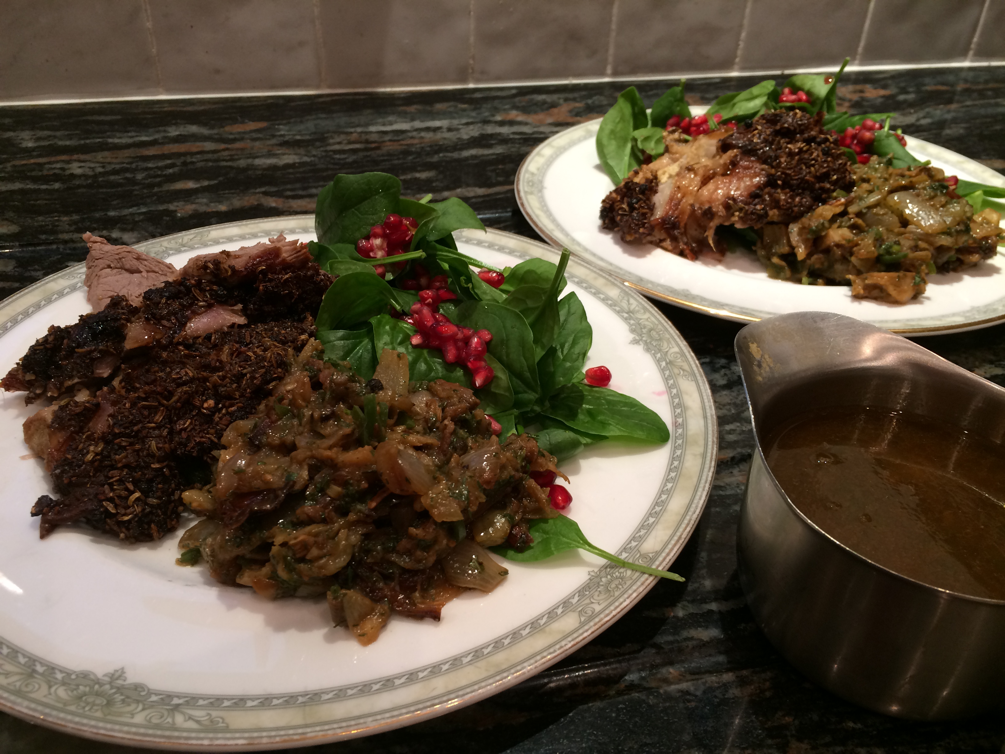 The fennel relish is deliciously rich and hot and the spinach and pomegranate salad makes the perfect partner to this rich dish.