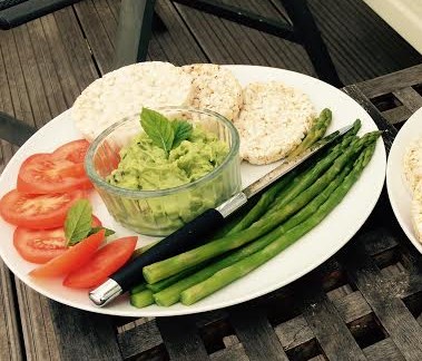 A light lunch – Guacamole with sliced pepper, vine tomatoes, Quinoa and Seed Rice Cakes and a slice of cheese.