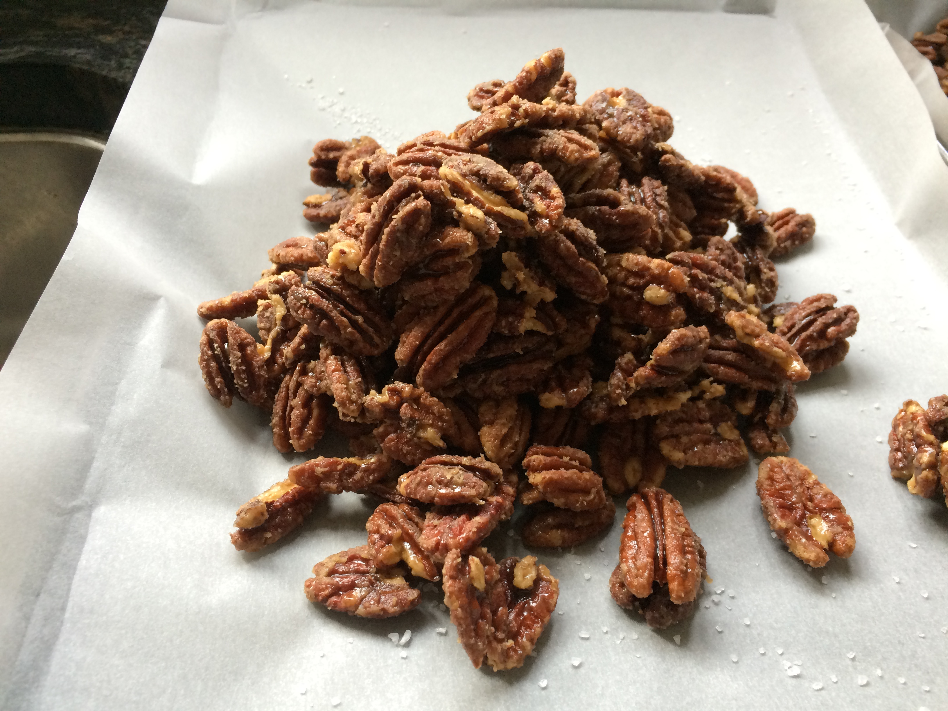 The quantity in this recipe makes one of the lined baking sheets which fills one of the clip-top jars. To make salty candied pecans, omit the spices except the salt. Sprinkle the parchment with coarse sea salt before piling on the pecans and when spread out, quickly sprinkle with a little more salt before allowing to cool.