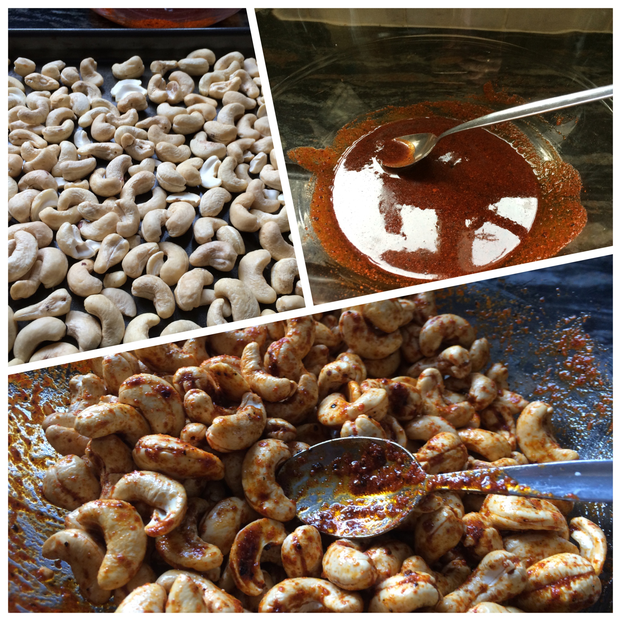 When the cashews are ready, tip them into the bowl and stir well until they are fully coated with the chilli mix.
