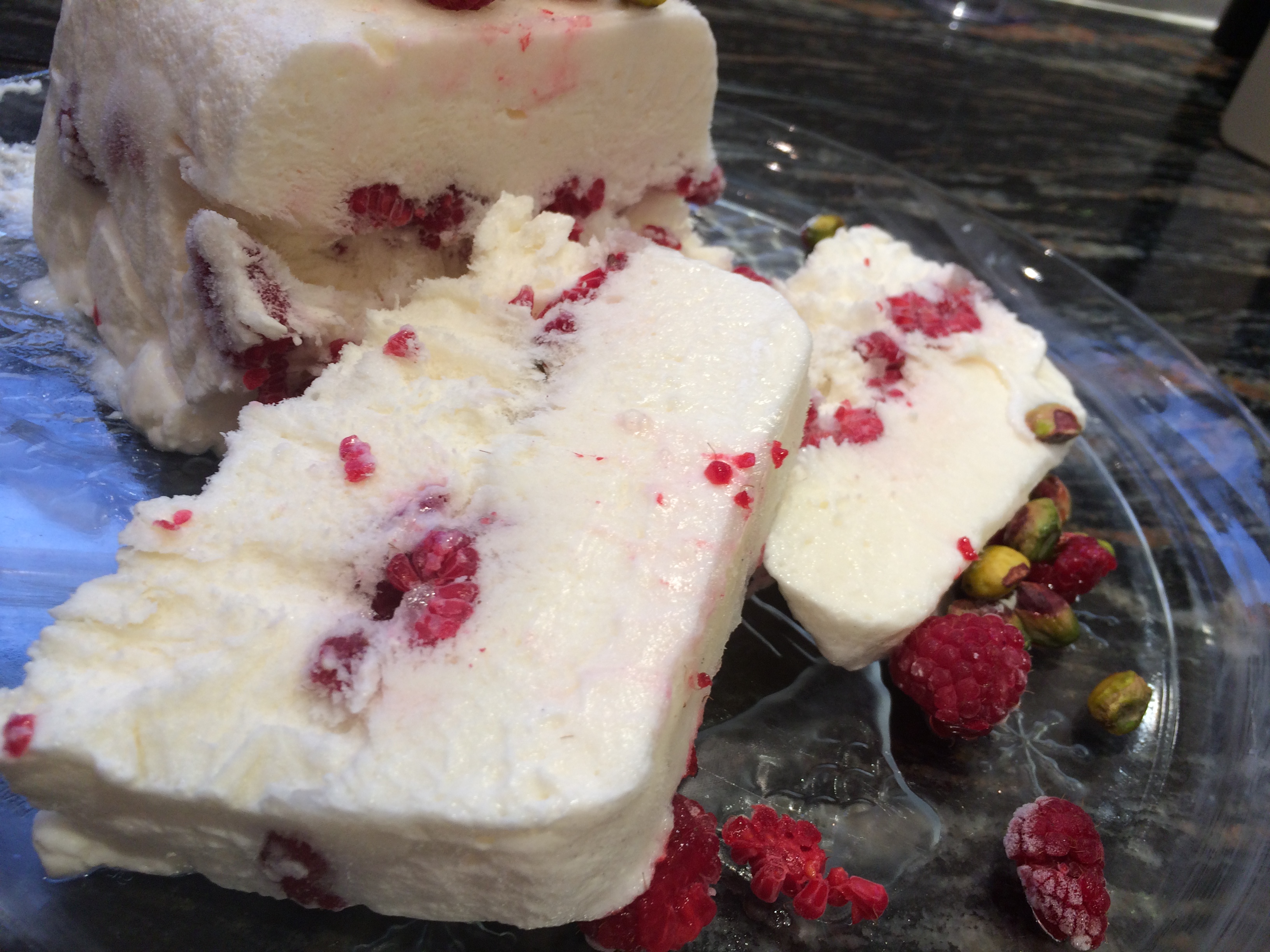 It is advisable to leave the dessert out for half-an-hour or so before serving to allow it to ‘come to’. It doesn’t freeze too solid and is able to be sliced immediately, but a slight thawing gives the dessert a delicious lightness, an almost mousse-like quality but lighter. Any semifreddo not eaten can be popped back into the freezer for another day.