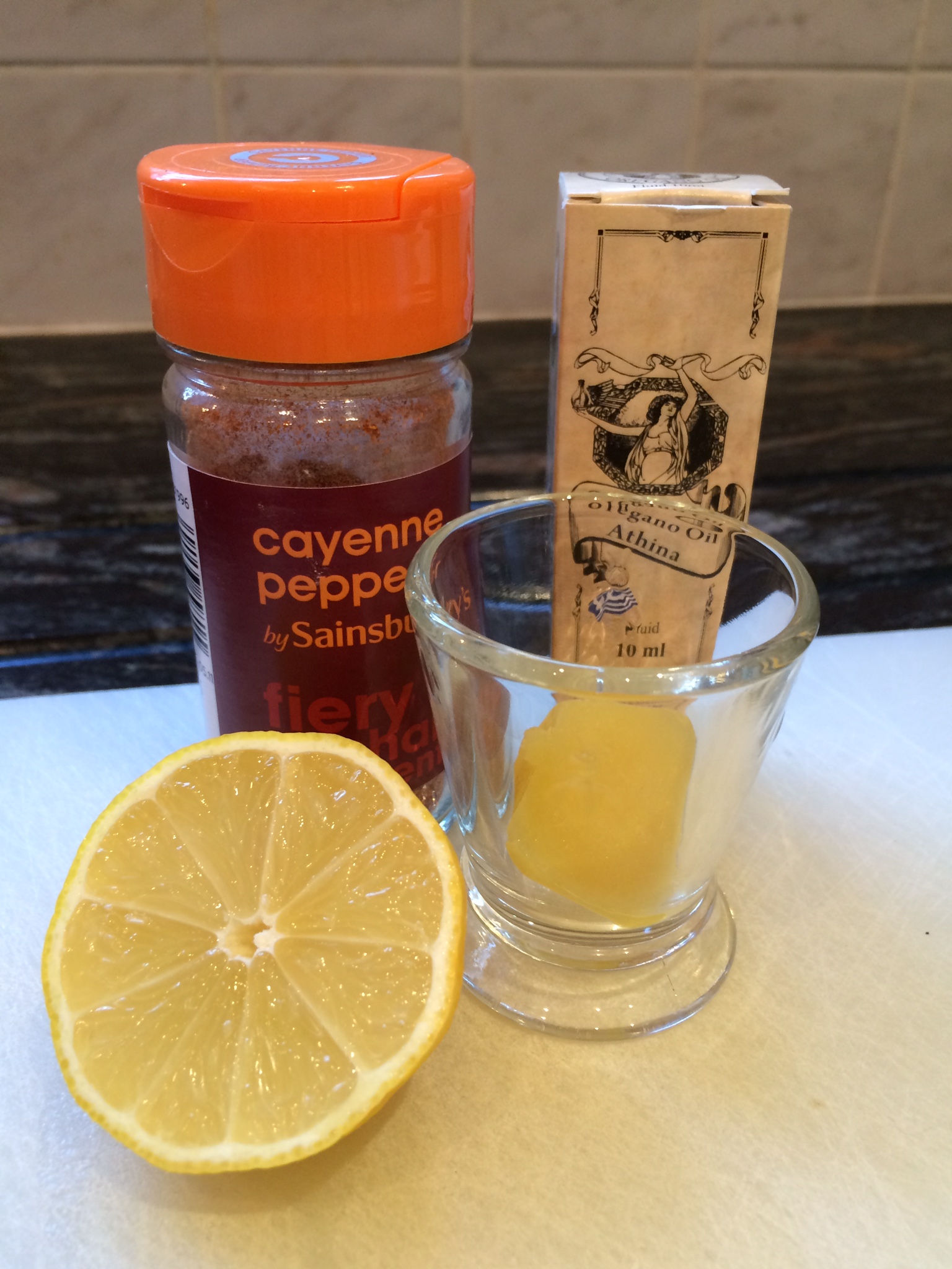 Process the ginger and lemon through your juicer. Alternatively pop a frozen ginger cube out of the ice-cube tray and add the juice of half a lemon. Pour the juice into a shot glass and top with a generous dash of cayenne pepper and 2 – 4 drops of oil of oregano. Drink in one go.