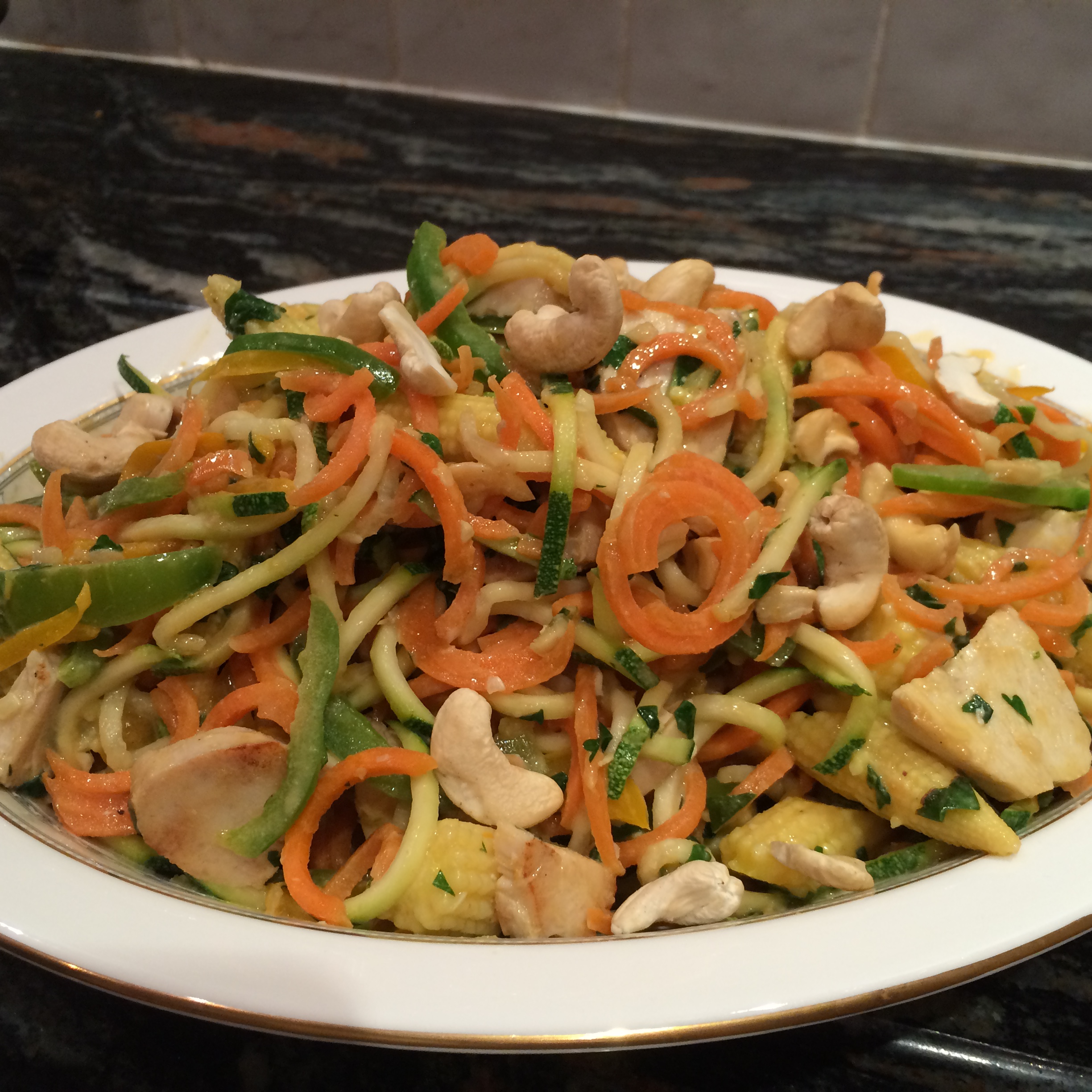 Add the vegetable noodles and cashews and continue to cook until they soften ever so slightly.