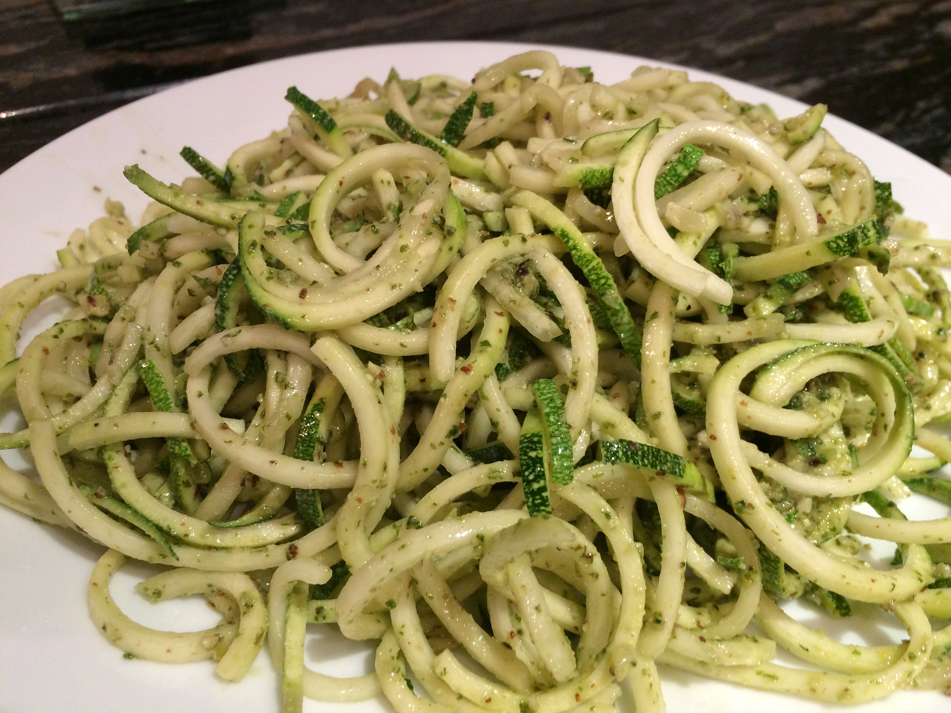 Spiralize the courgettes. Heat a little oil in a large pan and quickly sauté the noodles, tossing all the time. Don’t overcook as they will go soggy. Toss with the pesto and serve immediately. Alternatively, toss the pesto with raw courgettes – just as nice.