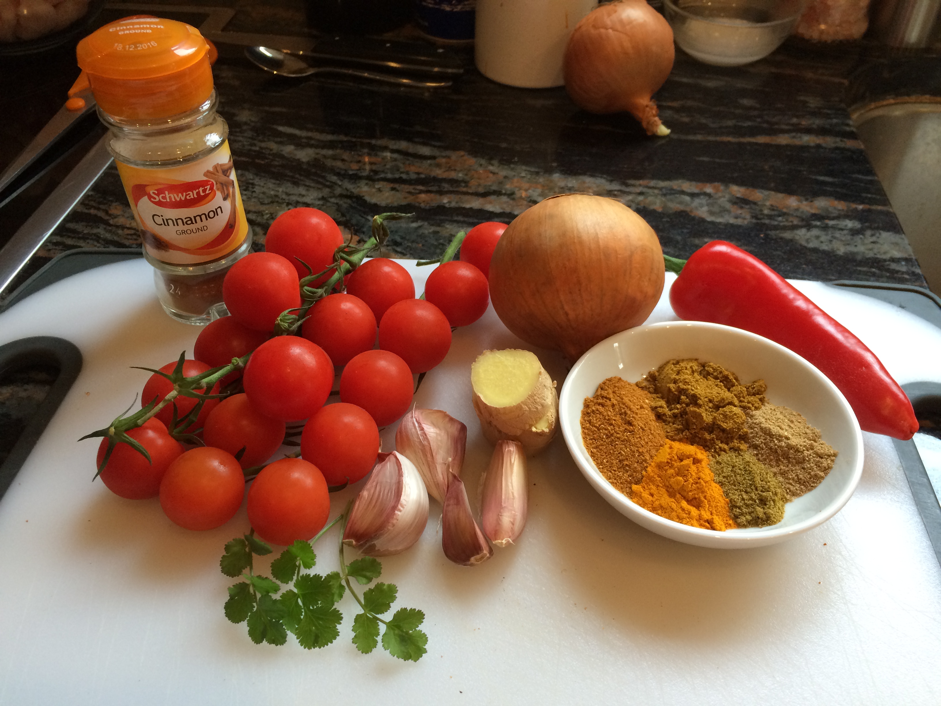 Once the purée has reached this stage, add the cherry tomatoes and all the spices except the cinnamon. Continue to cook for another 10 minutes, stirring frequently.