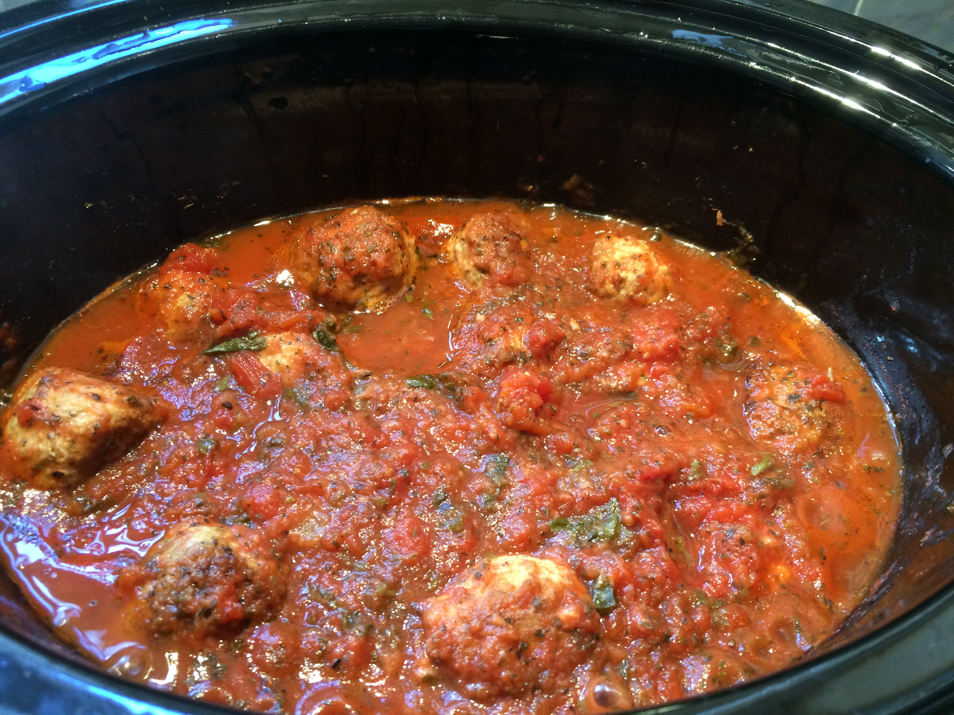Prepare the sauce directly in the slow-cooker. Place onion, crushed tomatoes, sauce, fresh basil leaves and dried herbs in the cooker and stir well. Add the meatballs and gently stir the meatballs into the sauce until each one is covered.