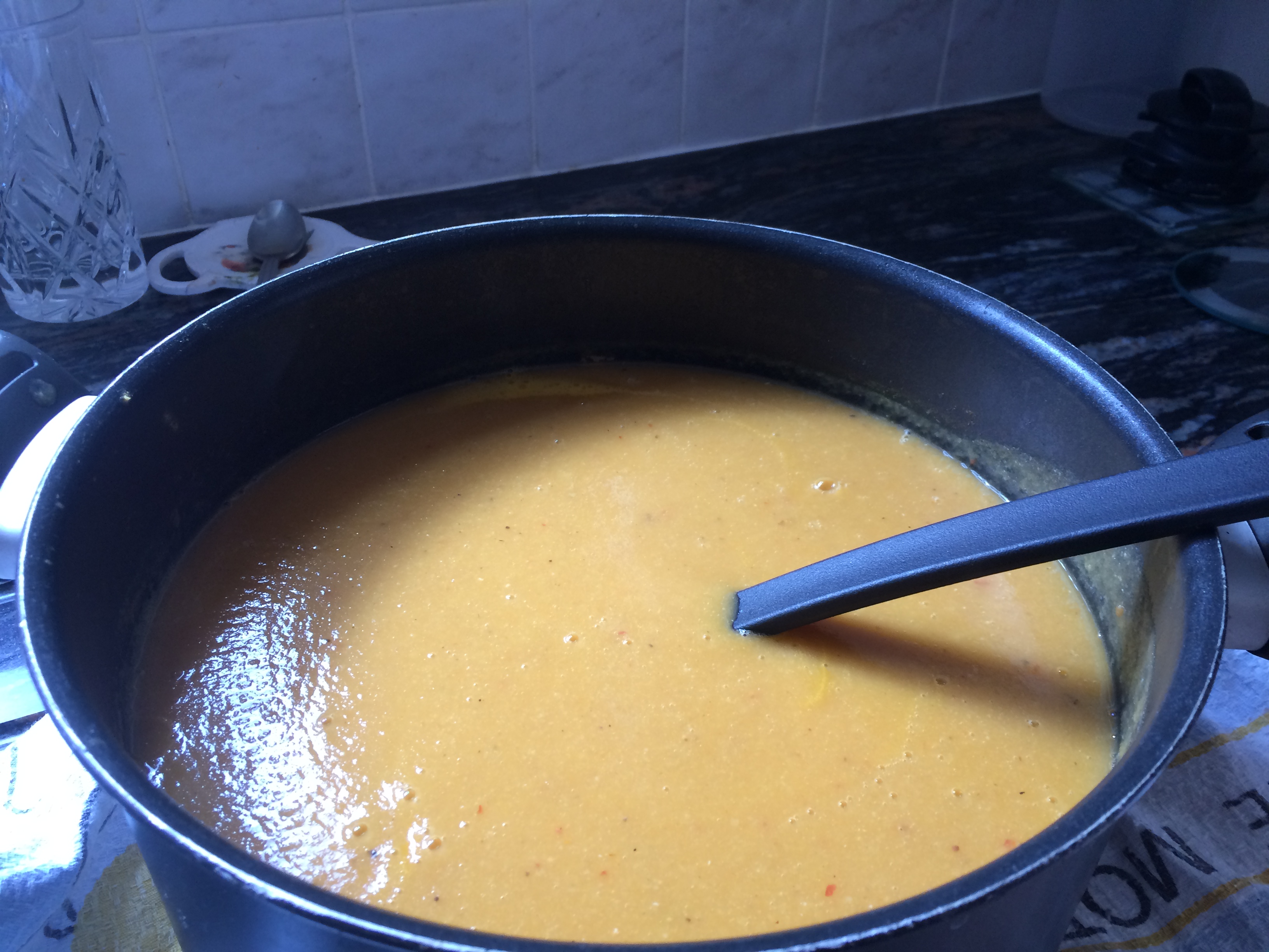 I had ended up with loads of carrots in my vegetable basket and as I like to keep my freezer well stocked, I decided to make some soup using what I had around the kitchen. Lentils are always a favourite and I added the flesh from a couple of oranges which were lingering in the fruit bowl, and to warm it up a little, some Berbere spice. I’ve always plenty of vegetable stock which I make myself from vegetable peelings and then freeze in handy quantities, so it didn’t take long before this soup was simmering on the hob.