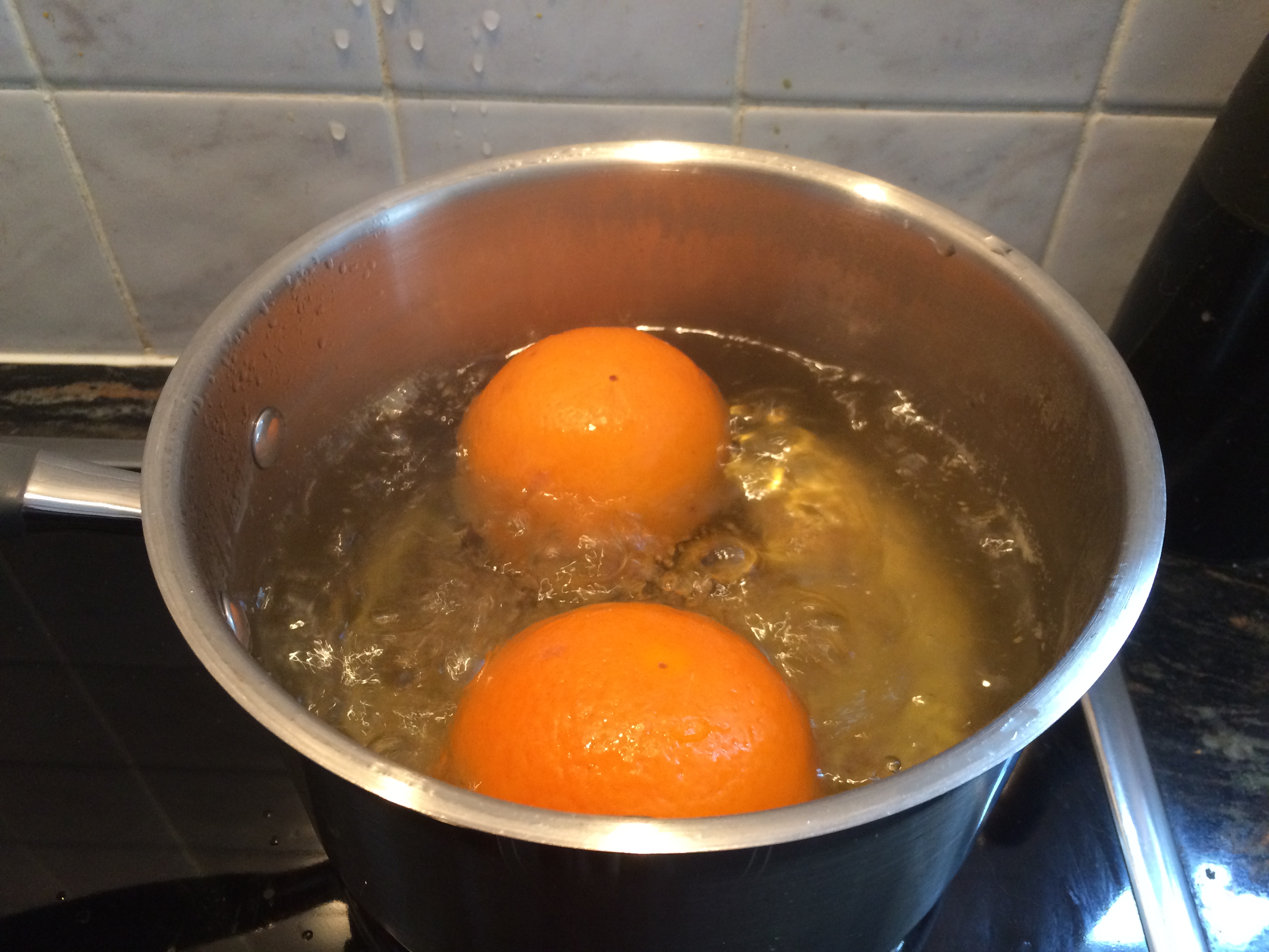 Put the oranges in a saucepan and cover with water. Bring to the boil and simmer for one hour. Lift them out of the water and allow them to cool.