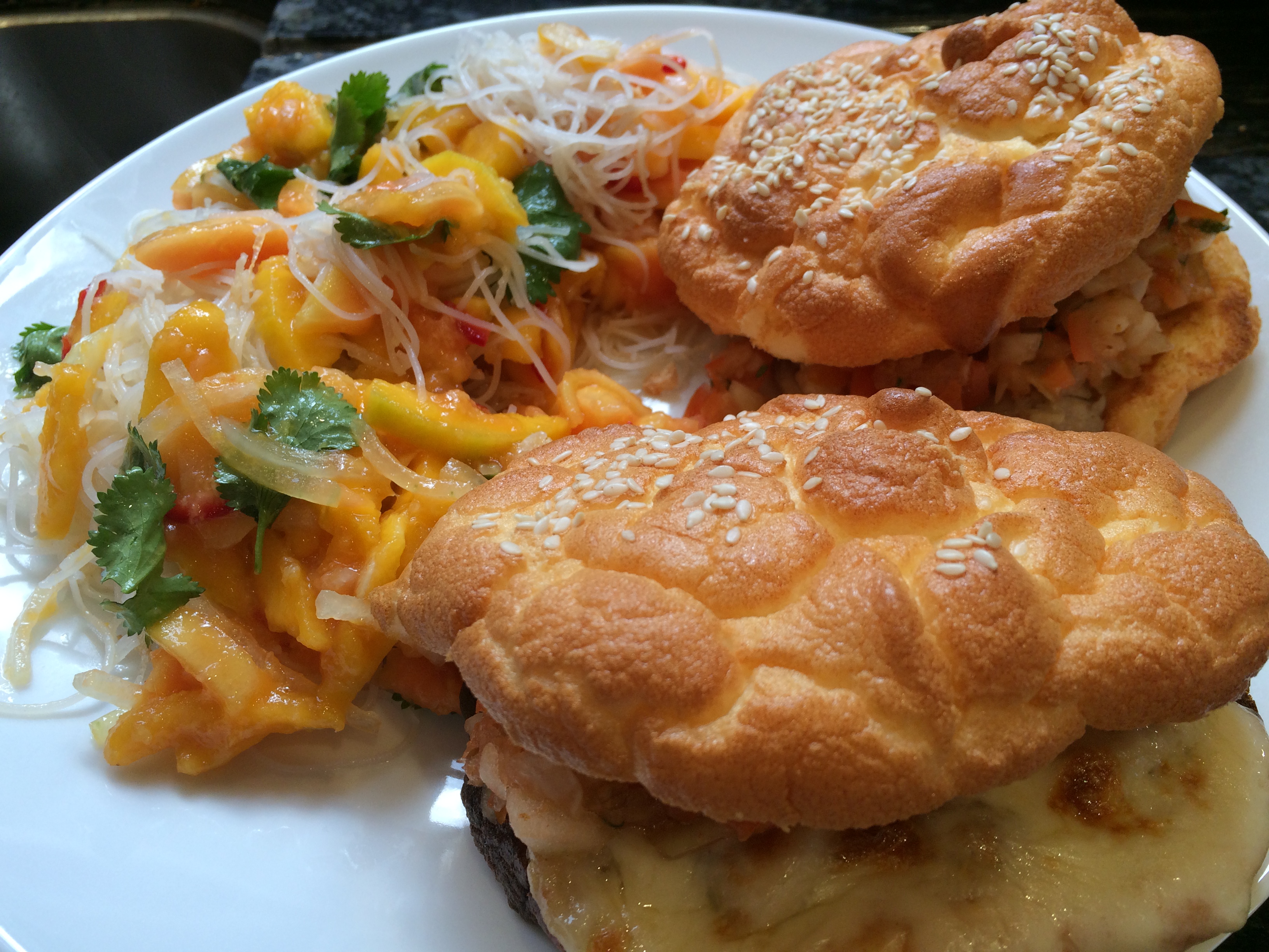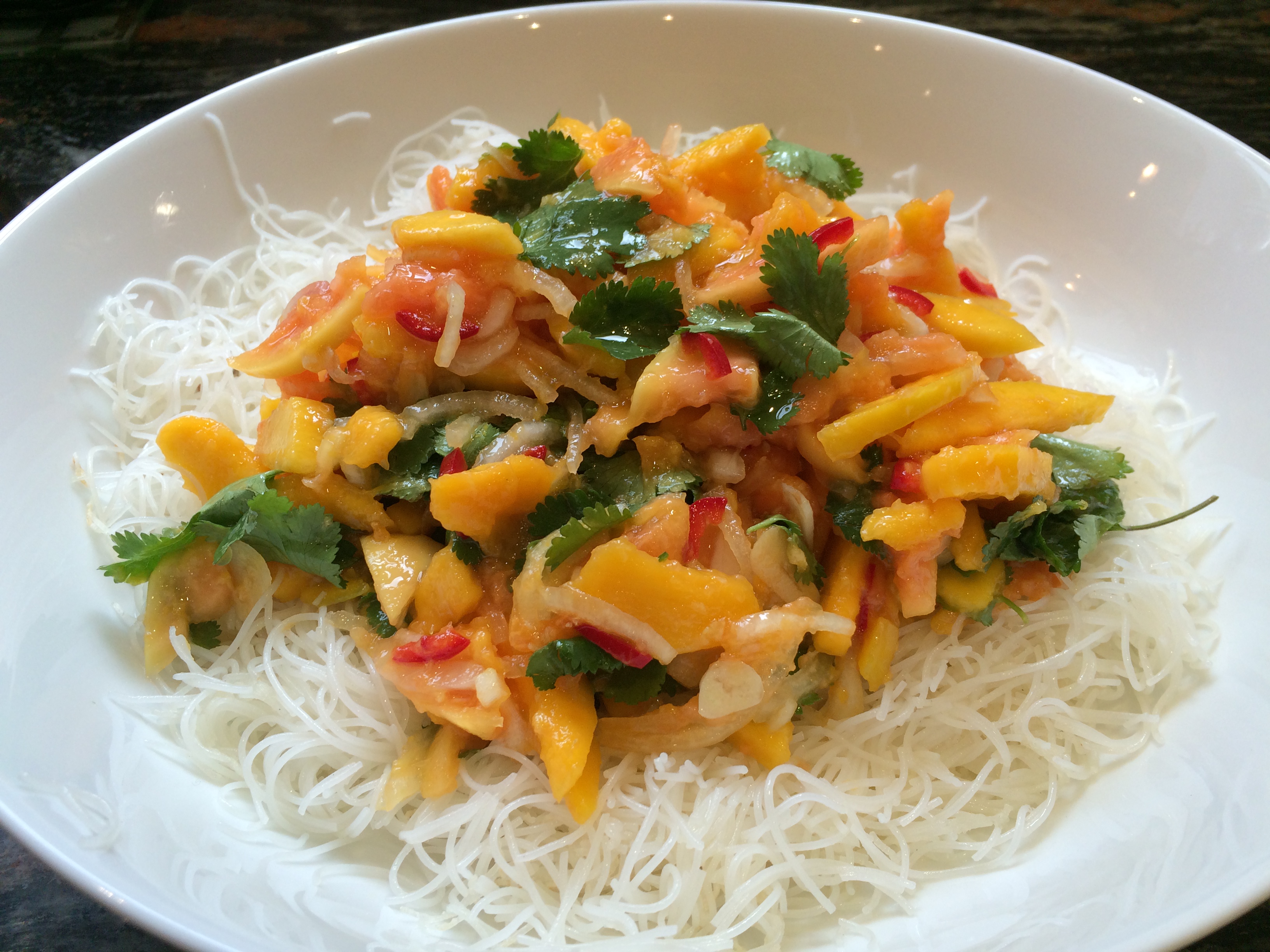 I didn’t have any red shallots so I used a white onion instead. This deliciously fruity, tangy salad was a lovely side dish to serve along with the chicken I cooked for my Cloud Bap burgers. I had a lovely bowl of roasted chopped cashews but only remembered to sprinkle them on after dishing up the salad (and taking the pictures) ! I also copied my d-in-law and served the salad on a bed of rice noodles. What a combination – absolutely divine.