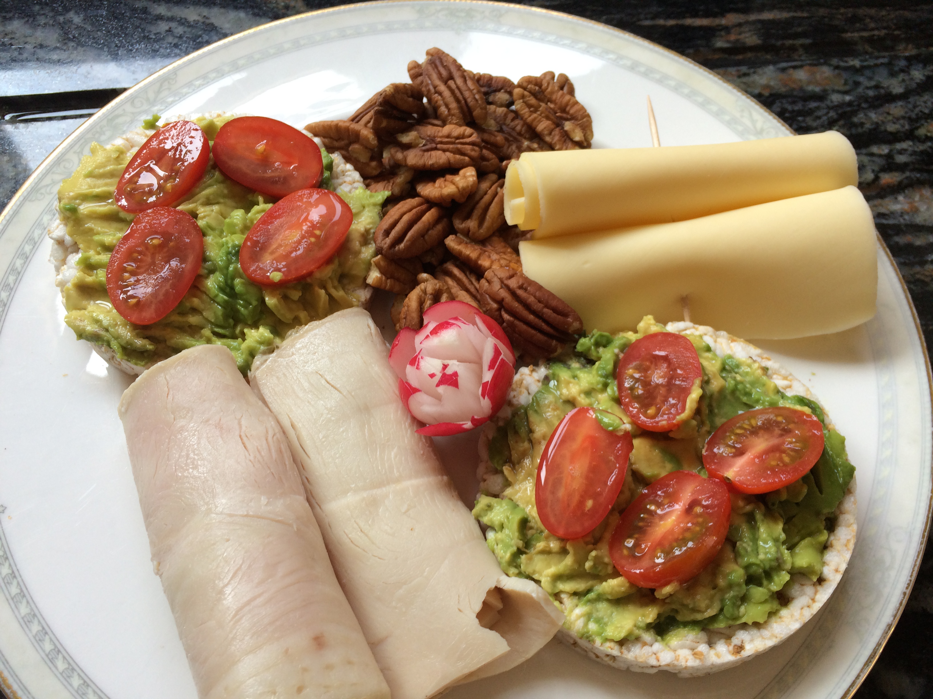 Add to this a few pecans (or walnuts if you prefer), a little turkey breast and a roll or two of your favourite cheese and you have a lunch fit for a king – or a princess (I watched my little grand-daughter hungrily spreading her rice cakes with avocado over the bank holiday weekend). Not forgetting my (not very good) attempt at a radish rose.