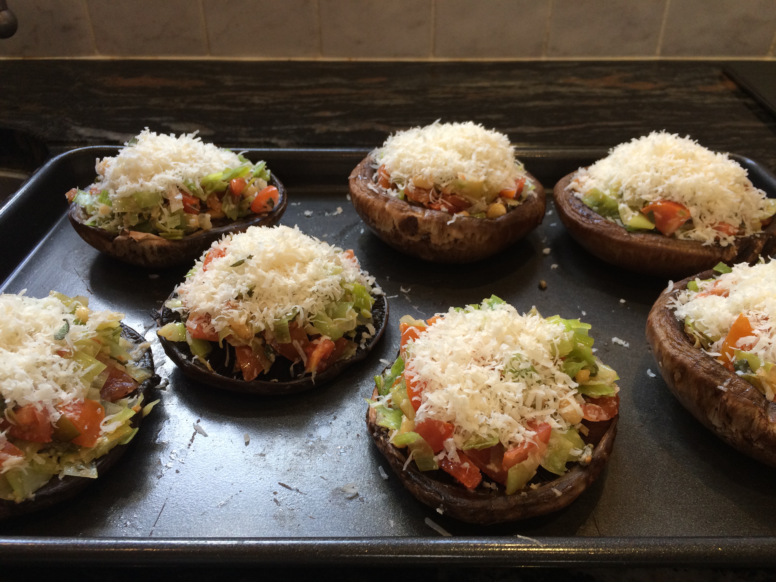 Place the mushrooms in a baking tin or ovenproof dish and top each one with the leek and tomato mixture. Sprinkle over the remaining Parmesan and cook in a 200C oven for 15-20 minutes until golden on top.