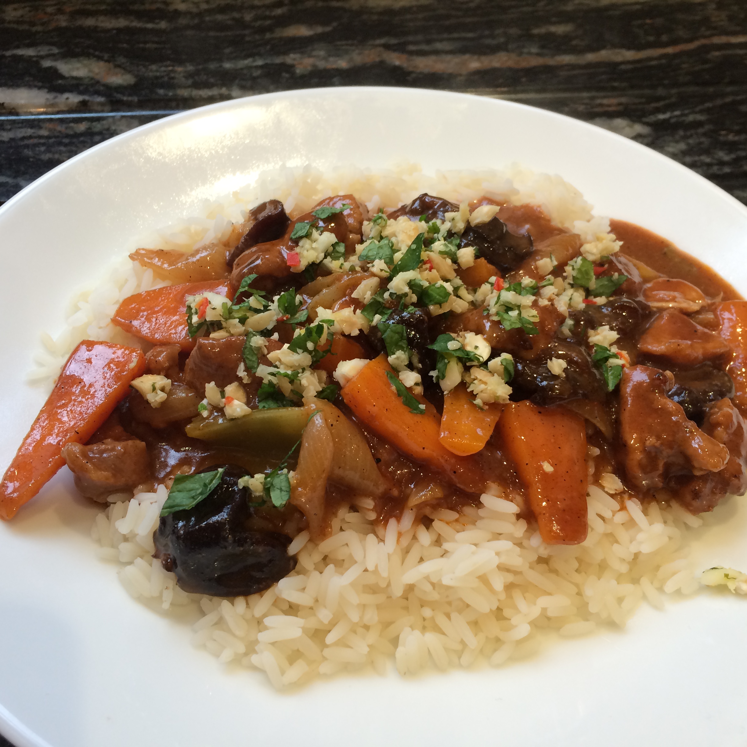 Add the pork, stock, honey, lemon zest and juice. Bring to a simmer and either cover with a lid and pop in the oven for one hour, or pour into the lidded casserole dish. After an hour, stir in the carrots (halve any large ones) and the dried fruit and cook for a further hour or until the meat is tender.