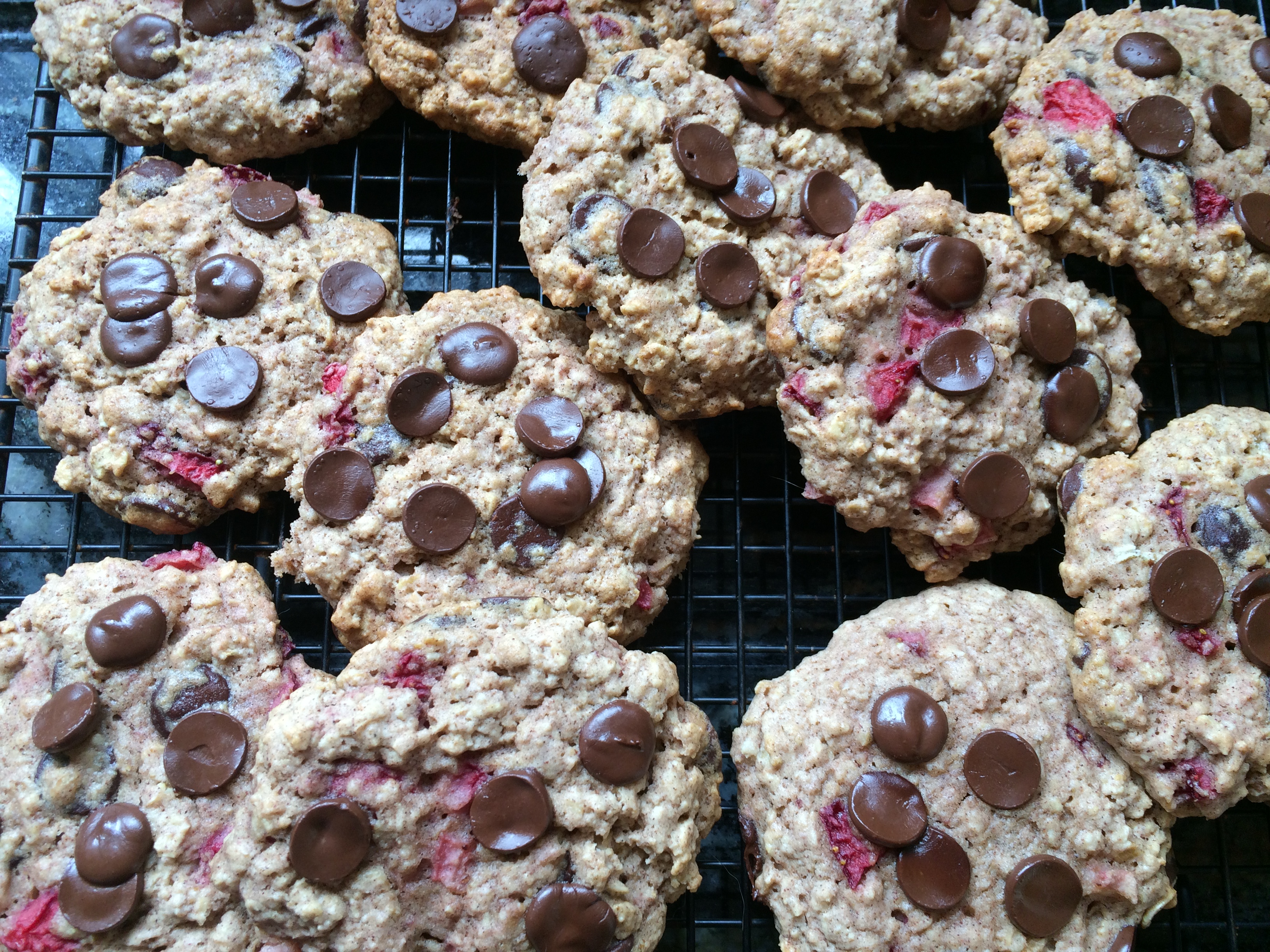 Add in the flour mixture, just folding it in. Add the strawberries and about half of the chocolate pieces. Chill the mixture for at least half an hour in the fridge.