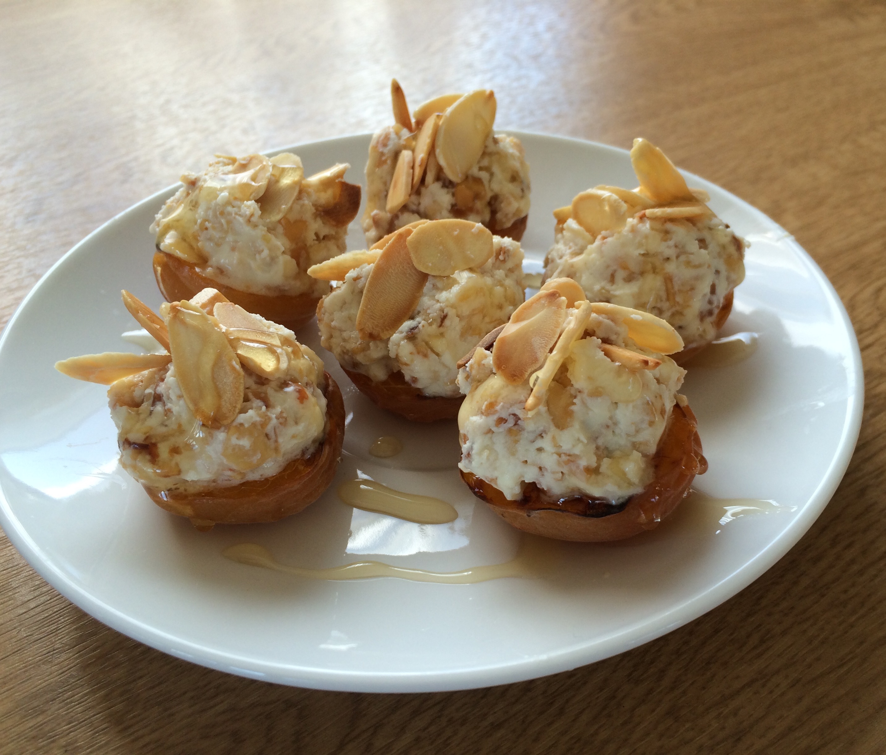 Out shopping the other day I spotted a punnet of delicious looking fresh apricots and immediately remembered seeing a recipe recently for stuffed apricots using ricotta and pistachios. I went into three local supermarkets but none of them stocked ricotta so I decided to try my own version using mascarpone, and almonds instead of pistachios. I also used lemon juice in place of a sweetener. The result was amazing. The wonderful sweet almondy topping on the slightly sweet/sharp fruity apricot was divine.