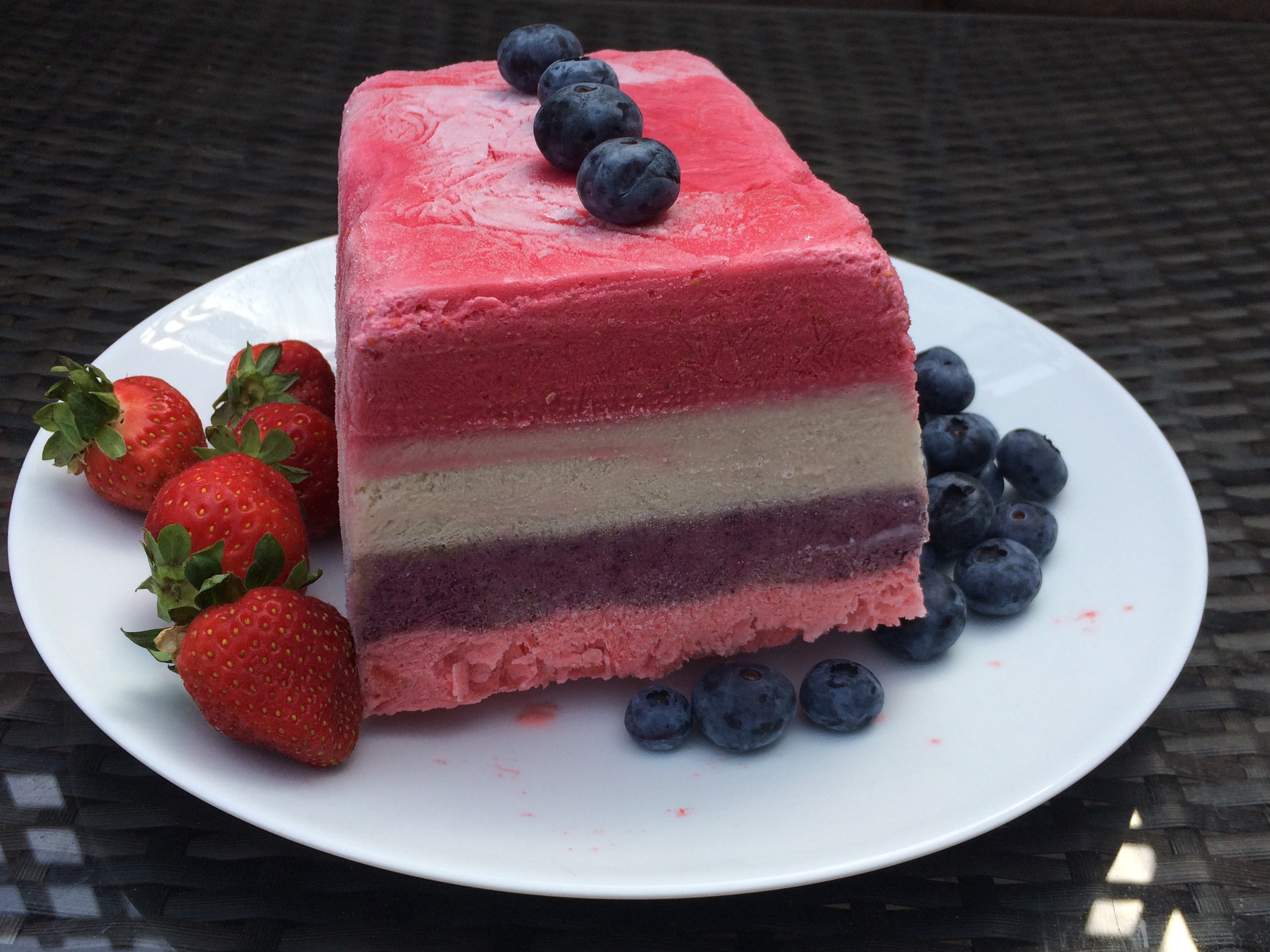 Leave the frozen ‘cake’ in the fridge for about an hour before needed to allow it to slightly soften; serve in slices with extra fruit.
