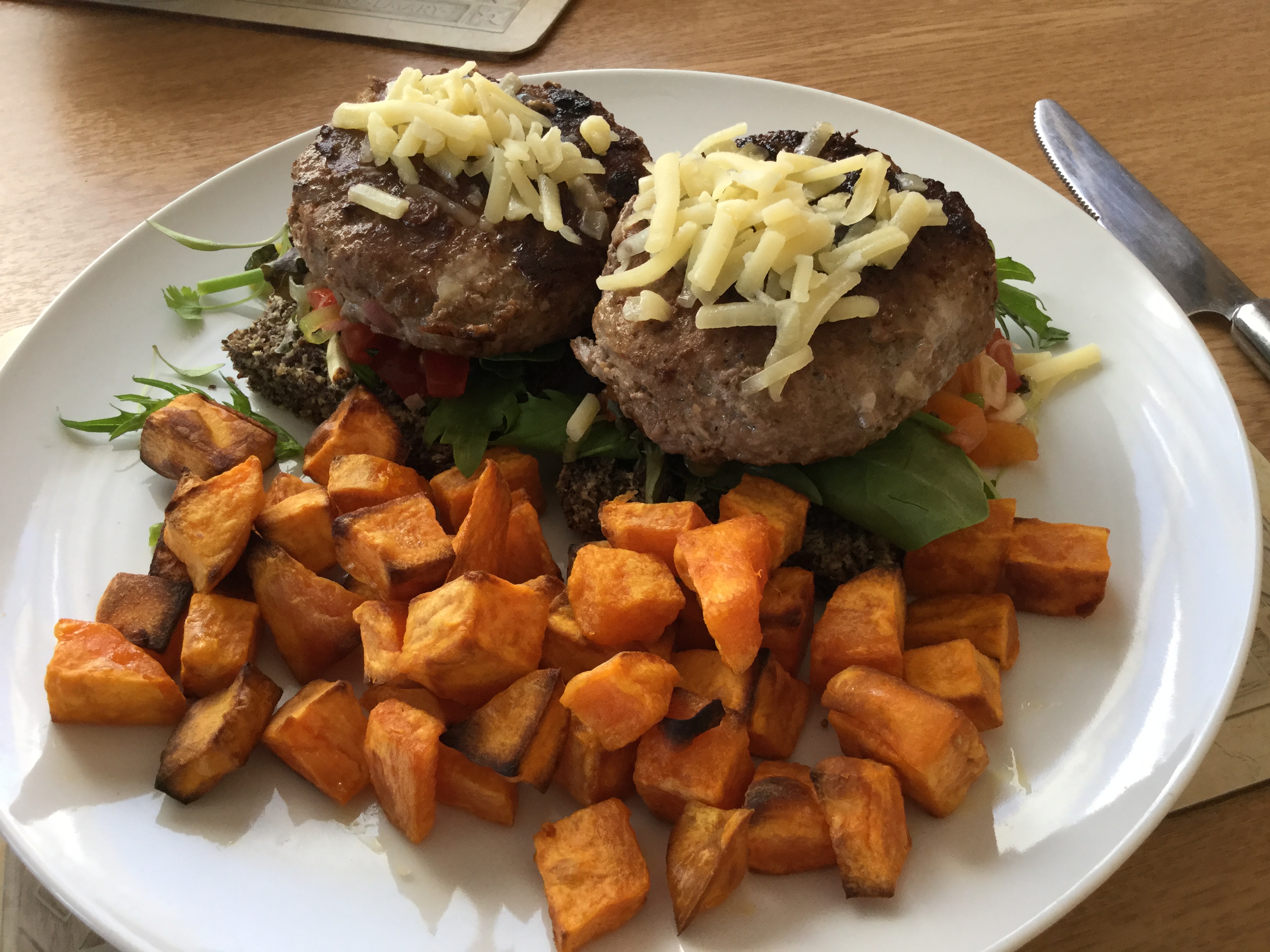 I used the leanest mince I could get (less than 5% fat);  the mustard gave the burgers a nice little ‘kick’ and next time I will experiment using some dried chilli flakes.