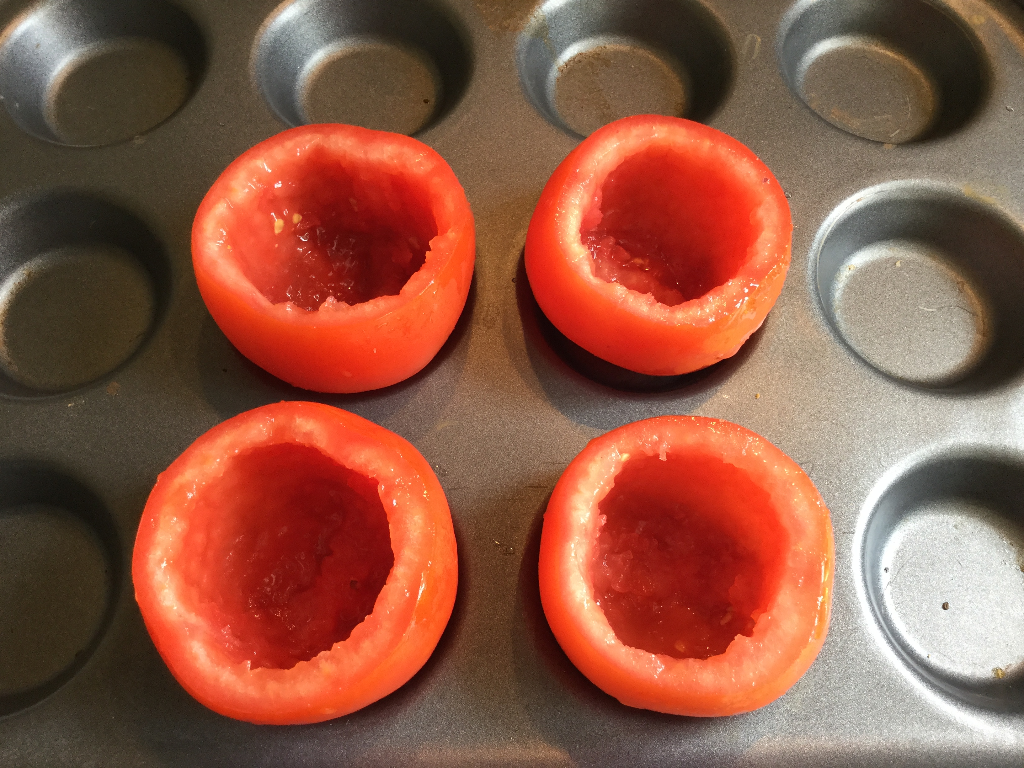 Slice the top off each tomato and carefully scoop out the membrane and seeds leaving a firm outer shell.