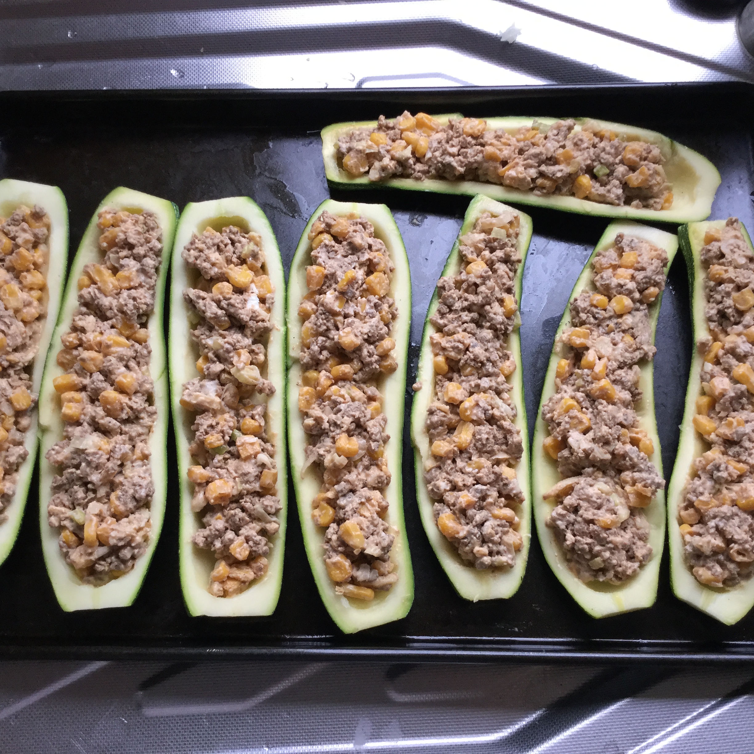 Fill the courgettes with the meat mixture and drizzle with olive oil.