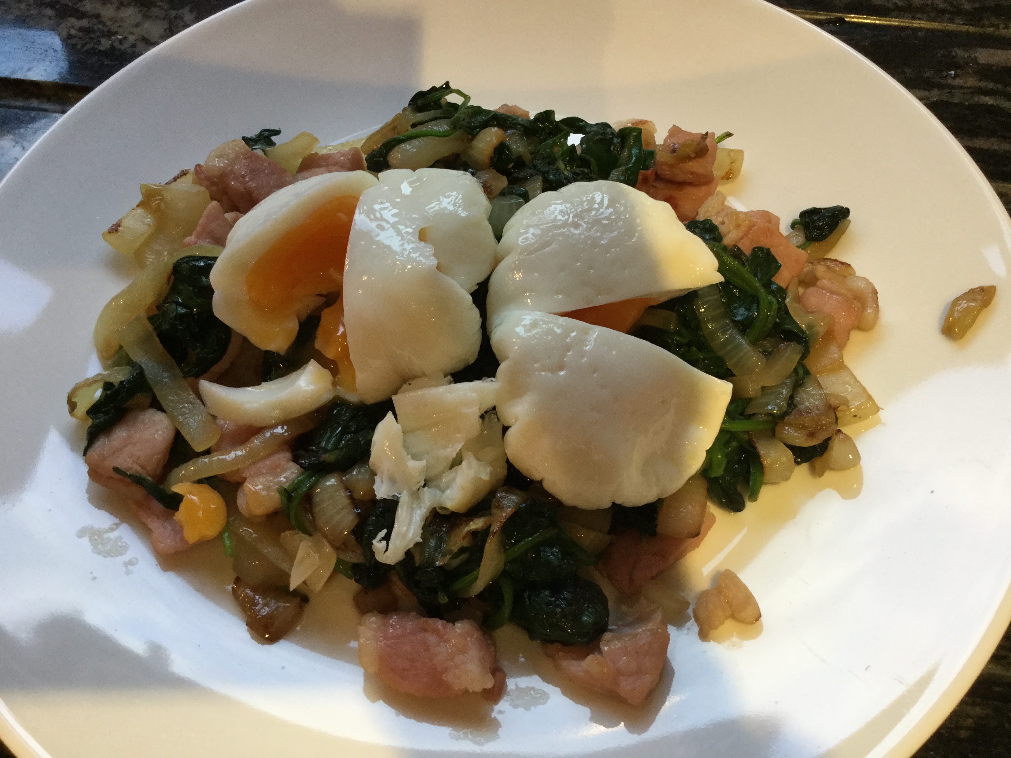 Just before the eggs are ready, add the spinach leaves to the fry pan and quickly toss to wilt.