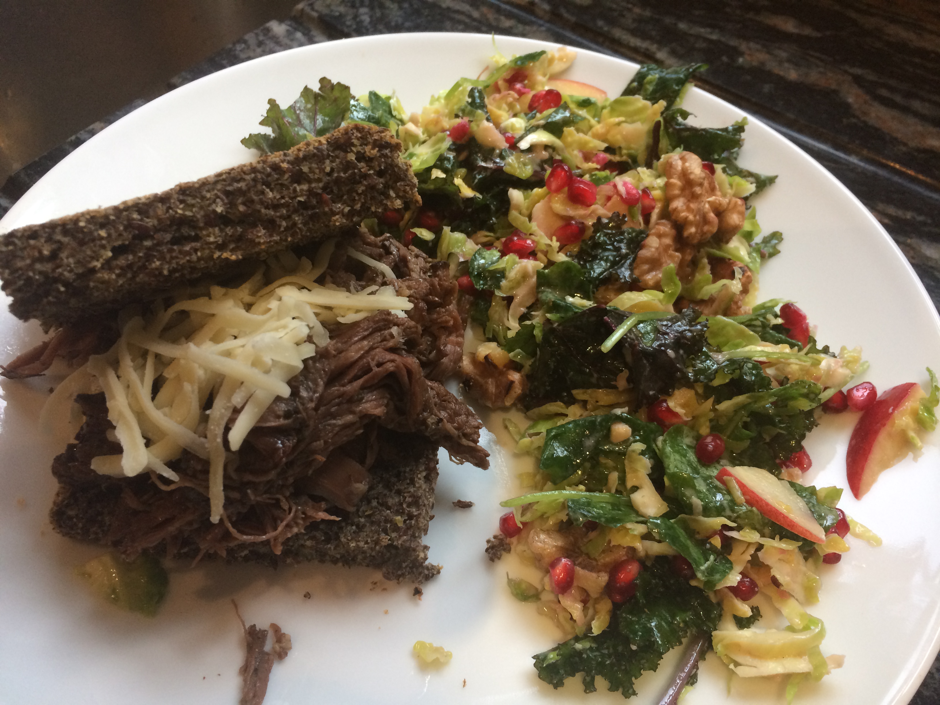 I served my Garlic and Ale Beef with my homemade Flaxseed Focaccia, toasted from the freezer, and a really tangy Kale, Brussel Sprout, Apple and Pomegranate Salad. It all went together perfectly. The beef could be served on bread rolls (if you are not gluten-free) or even to top a baked potato or baked sweet potato which is what we did with the left-overs.