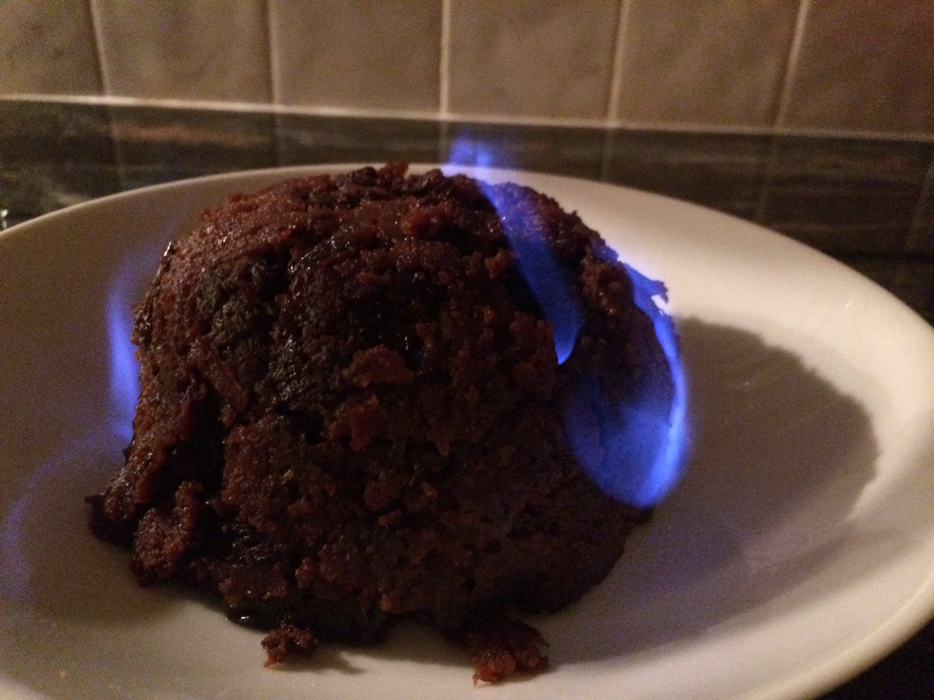 Mixing up all the fruit, spices and alcohol and leaving to steep overnight, had my kitchen smelling deliciously of past times and I was quite excited to see (and taste) the finished pudding. The recipe suggested using a 1.2L glass bowl but I decided to make a 1L pudding as well as a smaller one to have a trial run before the big day. I wasn’t disappointed !! I flamed the little pudding (just managed to catch a picture of it flaming) and there was sufficient for two good helpings for my husband and I to try out. We both loved the pudding – it was deliciously moist and full of fruity flavour.