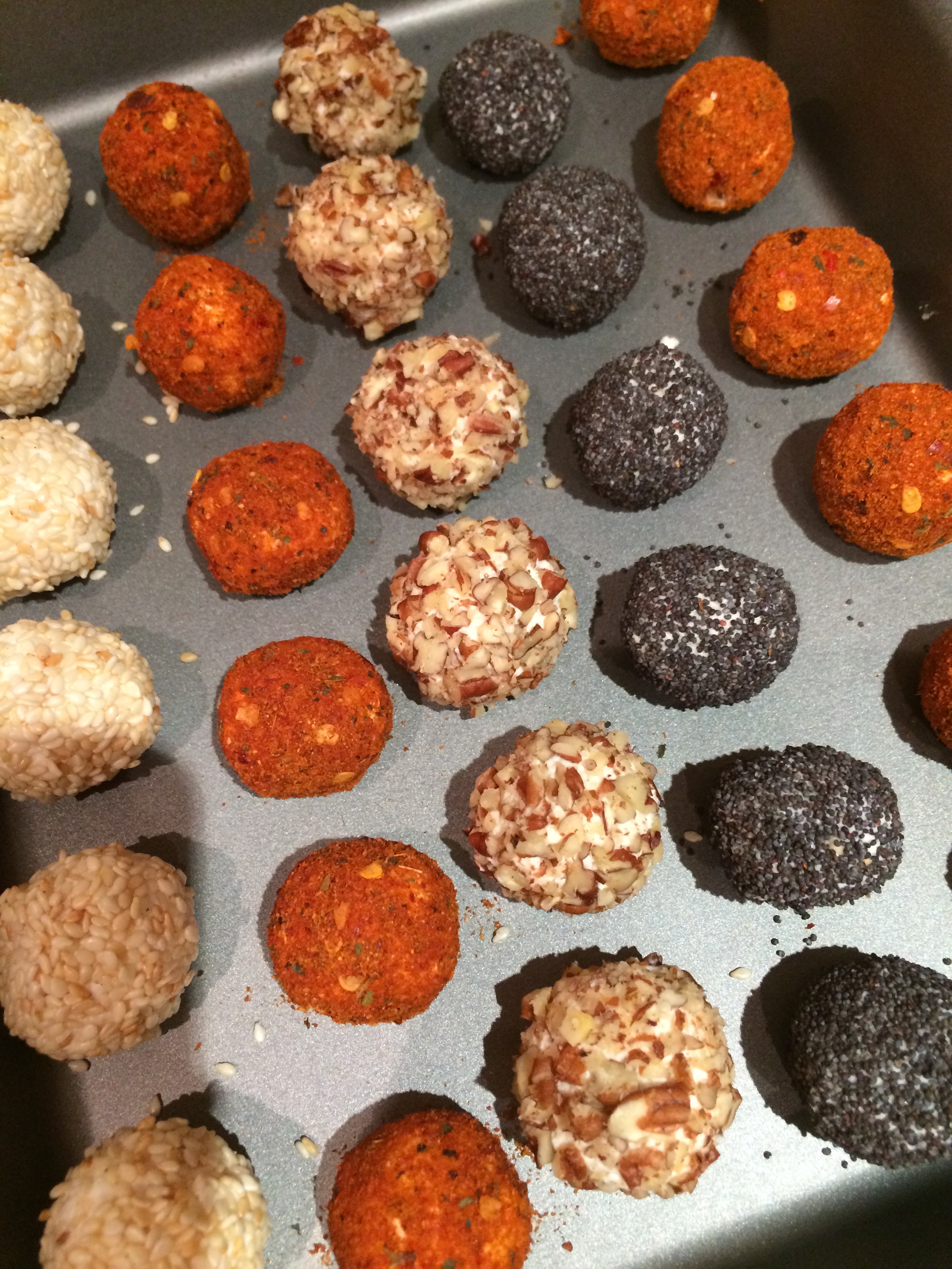 Scoop about a teaspoon of cheese into your hands and roll into a ball. Have ready bowls of coatings and drop the ball in to them and shake until well covered.
