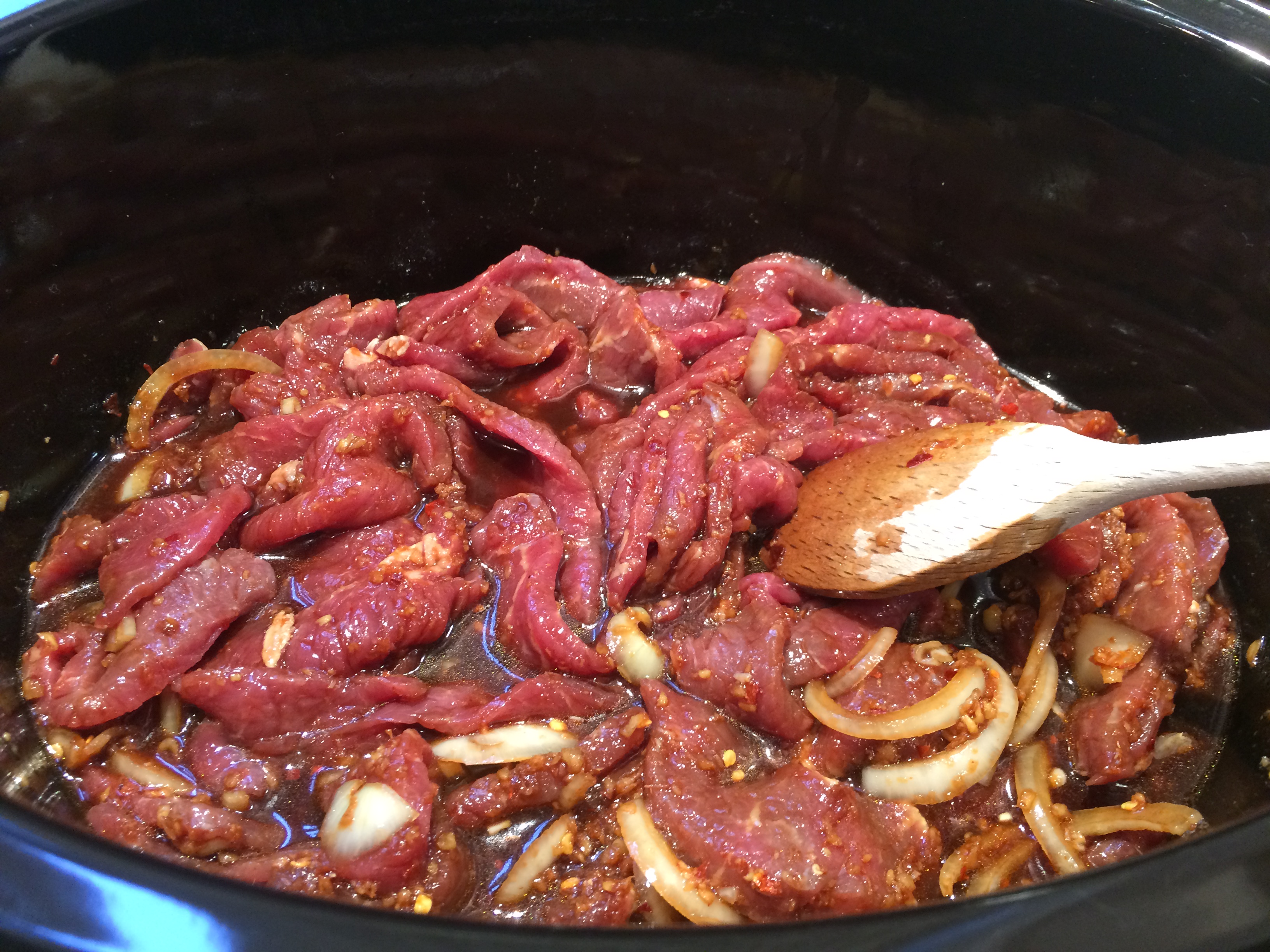 This dish only takes a few minutes to prepare; then about three hours in a slow cooker. I mixed all the ingredients together earlier in the day and just added them to the beef 3 hours before we wanted to eat.