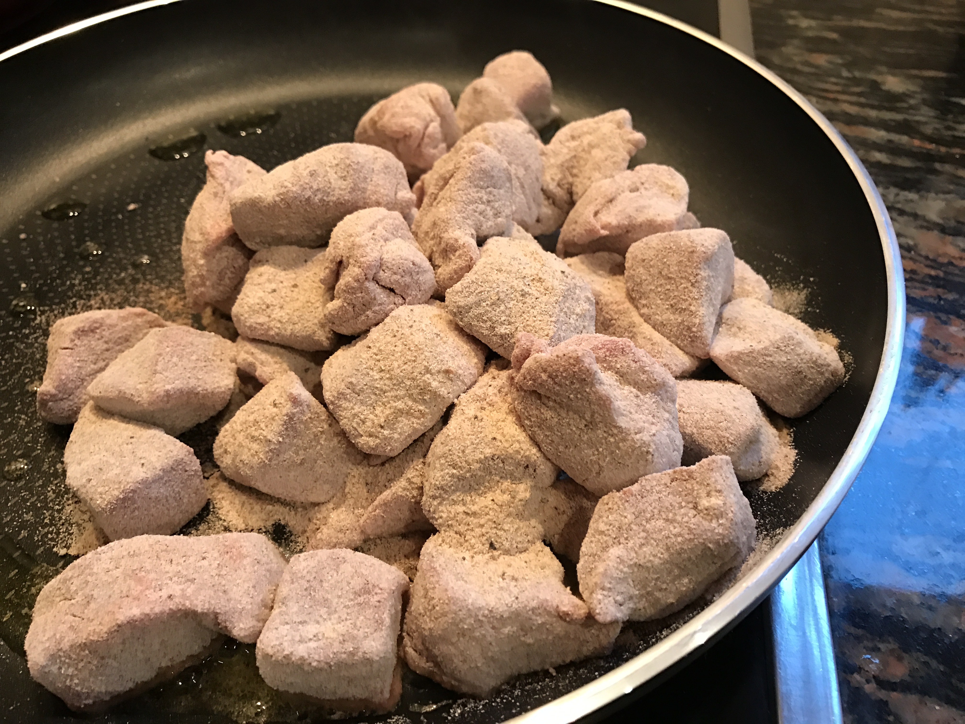 Using a plastic bag to coat the meat is just so easy and saves getting messy fingers. A quick shake and the meat is perfectly coated in flour and seasonings.