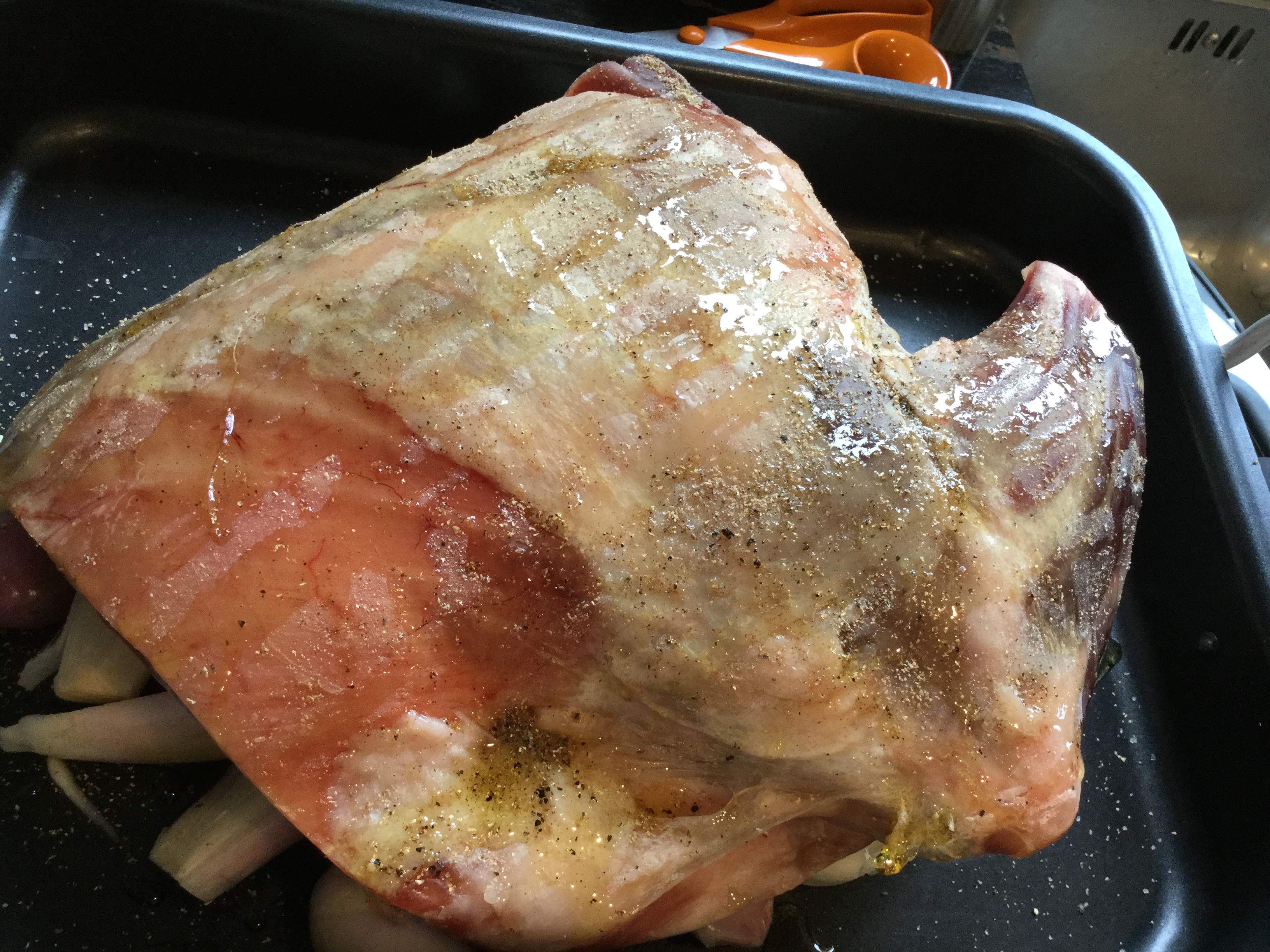 Rub into the lamb with some salt and pepper. Drizzle the meat generously with oil and pour the wine and stock into the tin.
