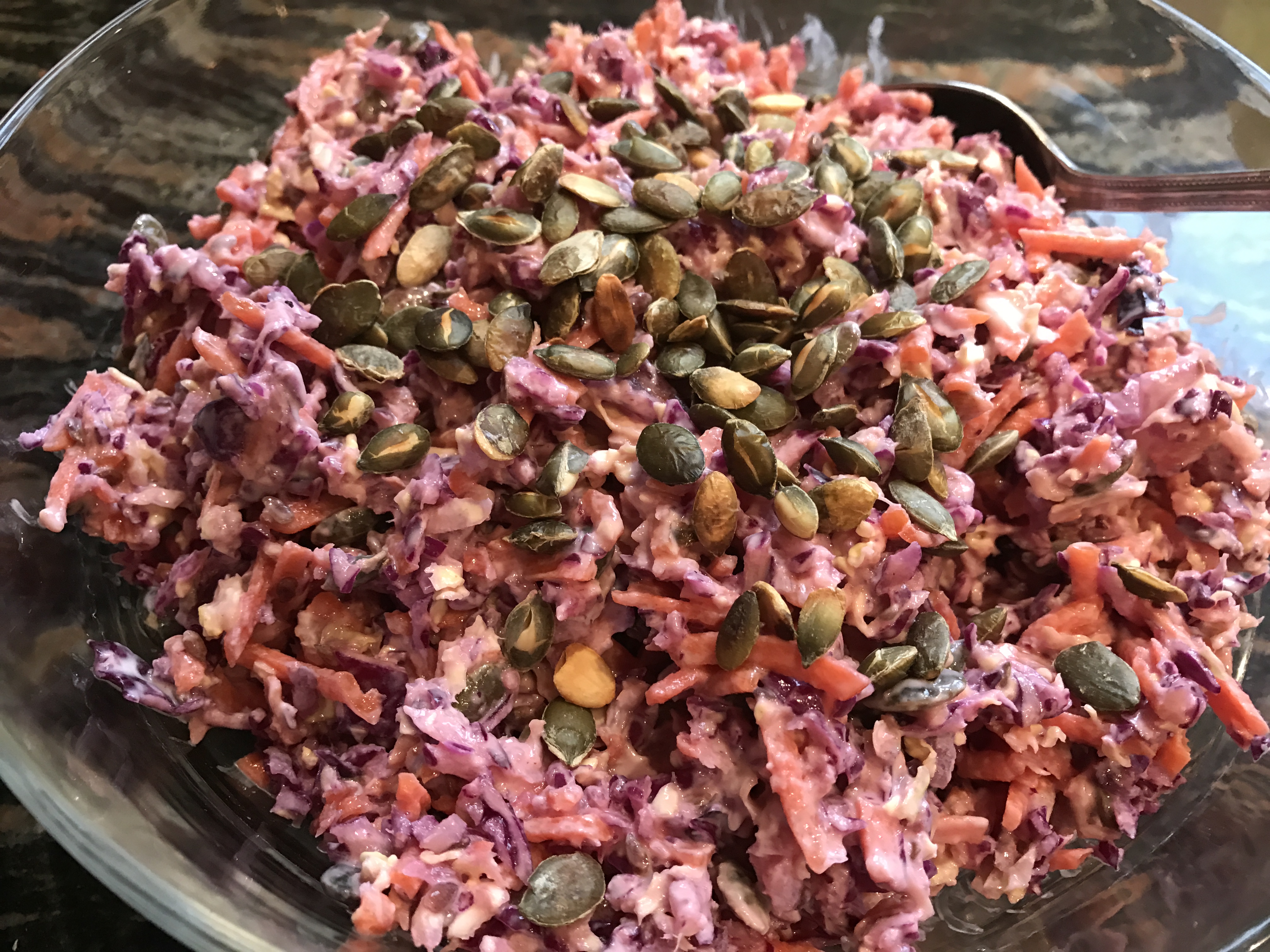Slice the vegetables very finely, or put them through a food processor using the large grate blade. If you prefer chunkier coleslaw, slice accordingly.Add the toasted seeds and mix well.
