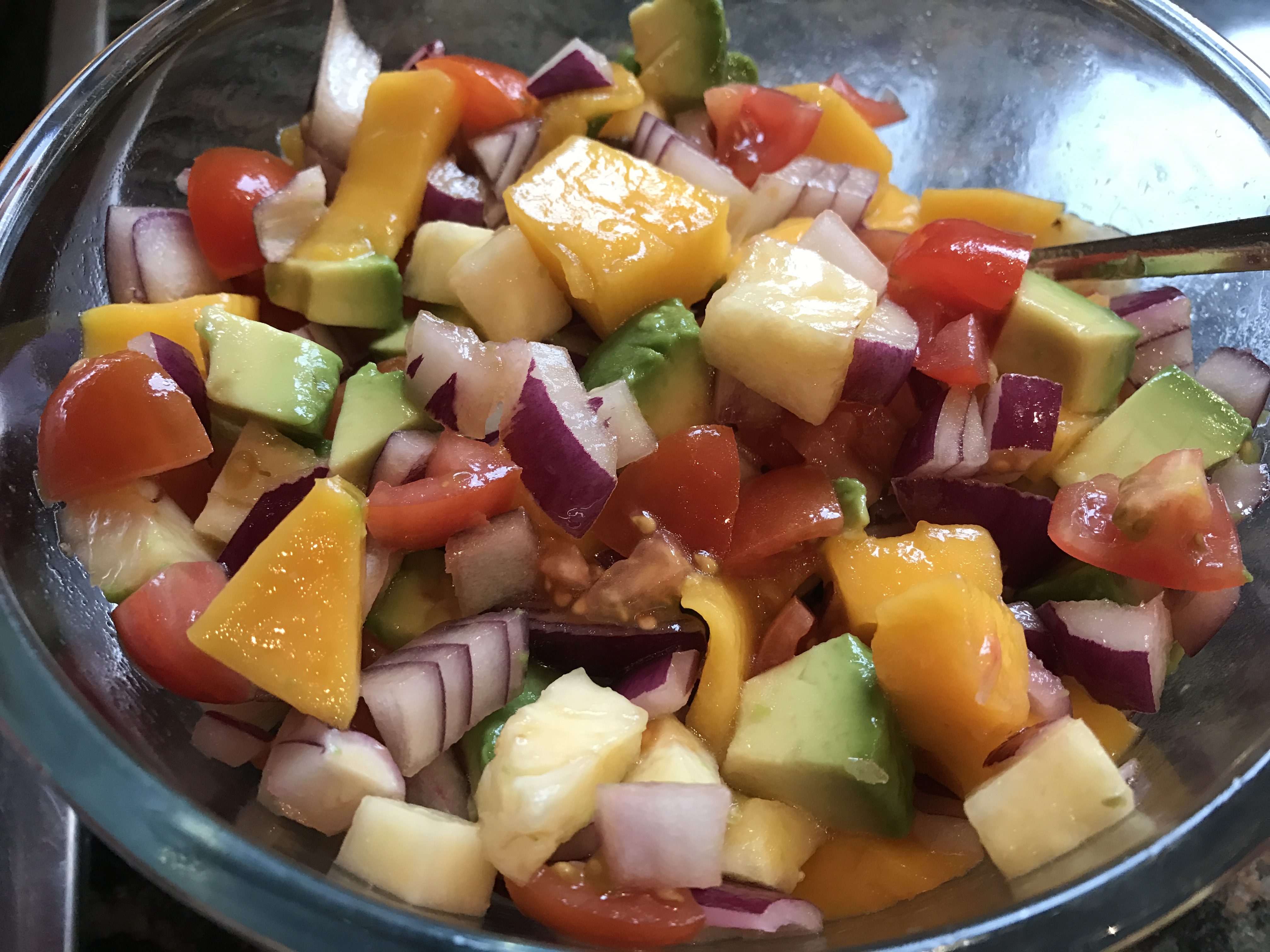 I called this a ‘fruit’ salsa as officially tomato is a fruit so the only non-fruit is the onion. I didn’t have any fresh herbs available (unusual for me) but this was just as delicious without. As a variation, I sometimes I add chopped garlic.
