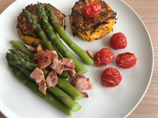 I decided to make Rosti using a combination of sweet potato and ordinary white potato and the result was absolutely delicious. I still par-boiled the white potato but not the sweet potato (this cooks much quicker) and it worked well.