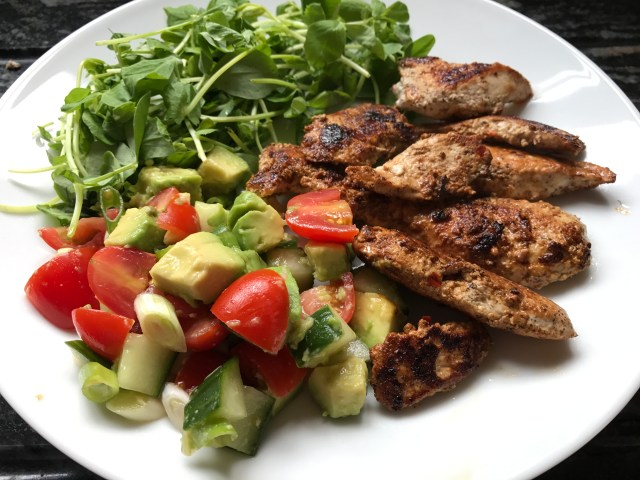 I like to serve the chicken with a tomato salsa and a green salad, adding some sweet potato ‘chips’ if anyone is extra hungry.