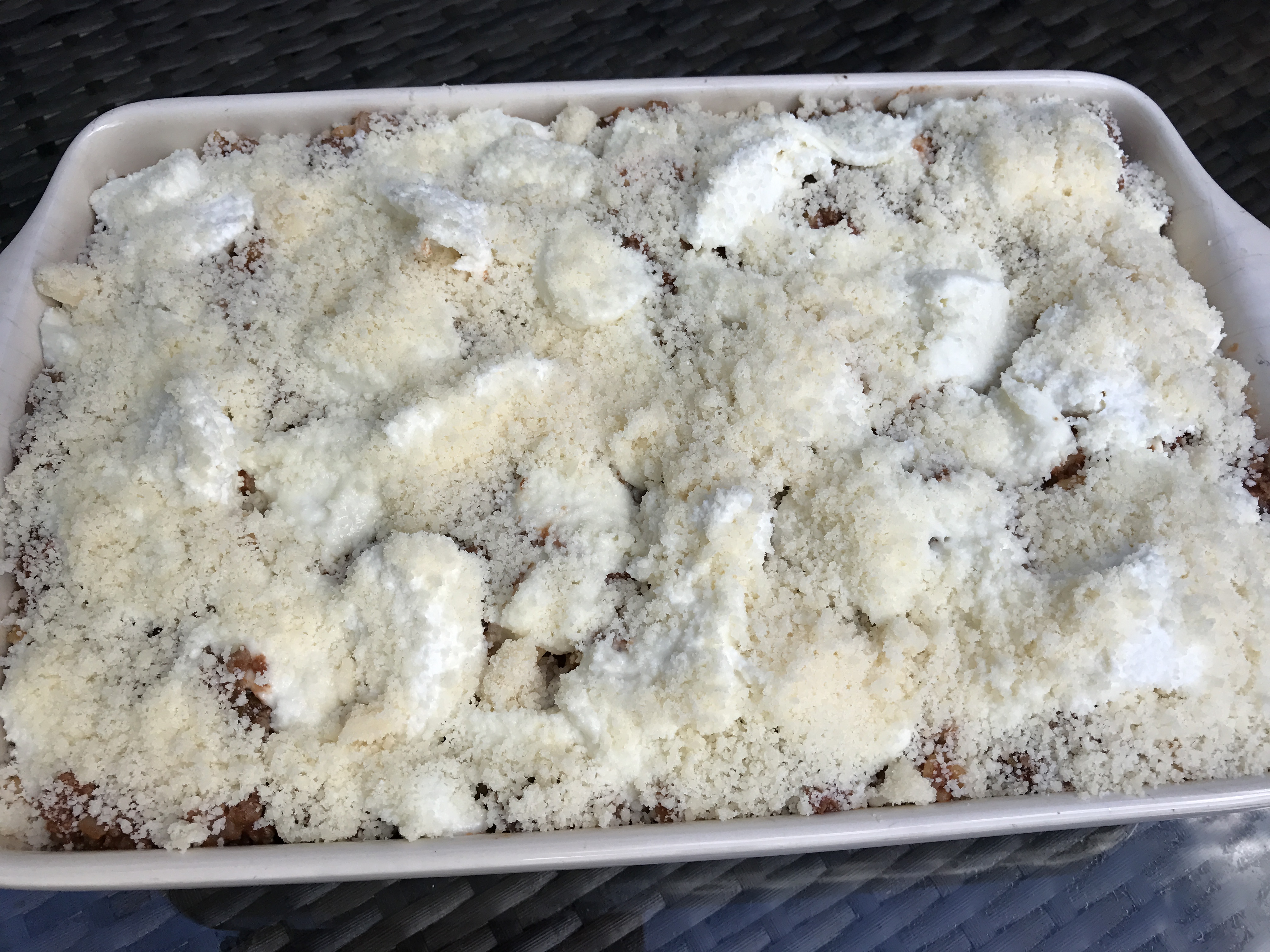 Now I know that my grand-kids love lasagna so I thought I would give this dish a whirl whilst changing just a couple of ingredients so that my gluten-intolerant husband could enjoy it as well. Instead of using Ziti macaroni, I used gluten-free pasta, used only a pinch of crushed chilli flakes (not too hot for the kids) and made my own marinara sauce with a couple of cartons of chopped tomatoes, tomato paste, onion, garlic, parsley, oregano, salt, pepper and a splash of wine. You could cheat and buy a jar from the supermarket if you wanted to.