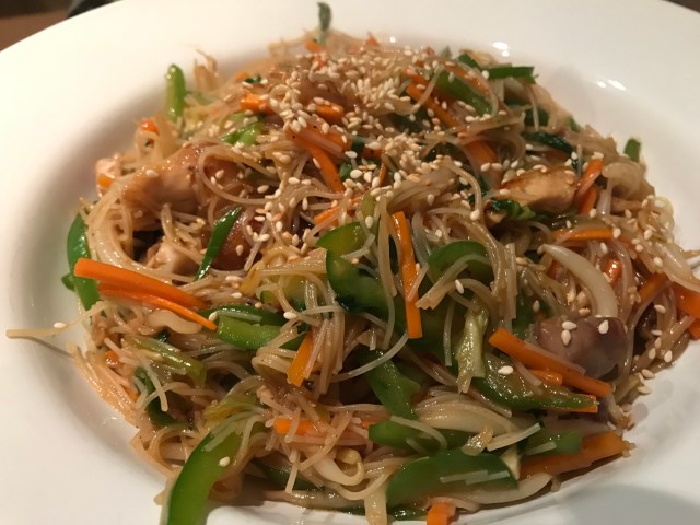 Add the chopped garlic and grated ginger to the fat in the pan and saute for about 1 minute. Add the bok choy, carrot sticks, green pepper and onions and cook, tossing frequently, for 1 to 2 minutes until lightly cooked but still crispy. Season then add the noodles and beansprouts and toss well. Pour the sauce over the vegetables and add the chicken. Toss well for another minute until heated through and the sauce is mixed in well.
