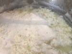 Pull the muslin up (I used clean kitchen gloves as it is quite hot at this point) and squeeze as much moisture out of the cheese as possible.