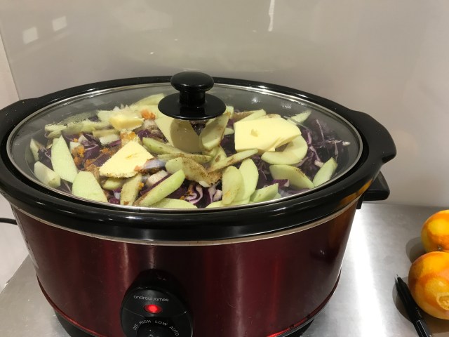 Arrange a layer of the cabbage in the slow cooker, then top with some of the onions, apples, zest, mixed spice, sugar and seasonings. Continue layering up the ingredients until you have used them all up.