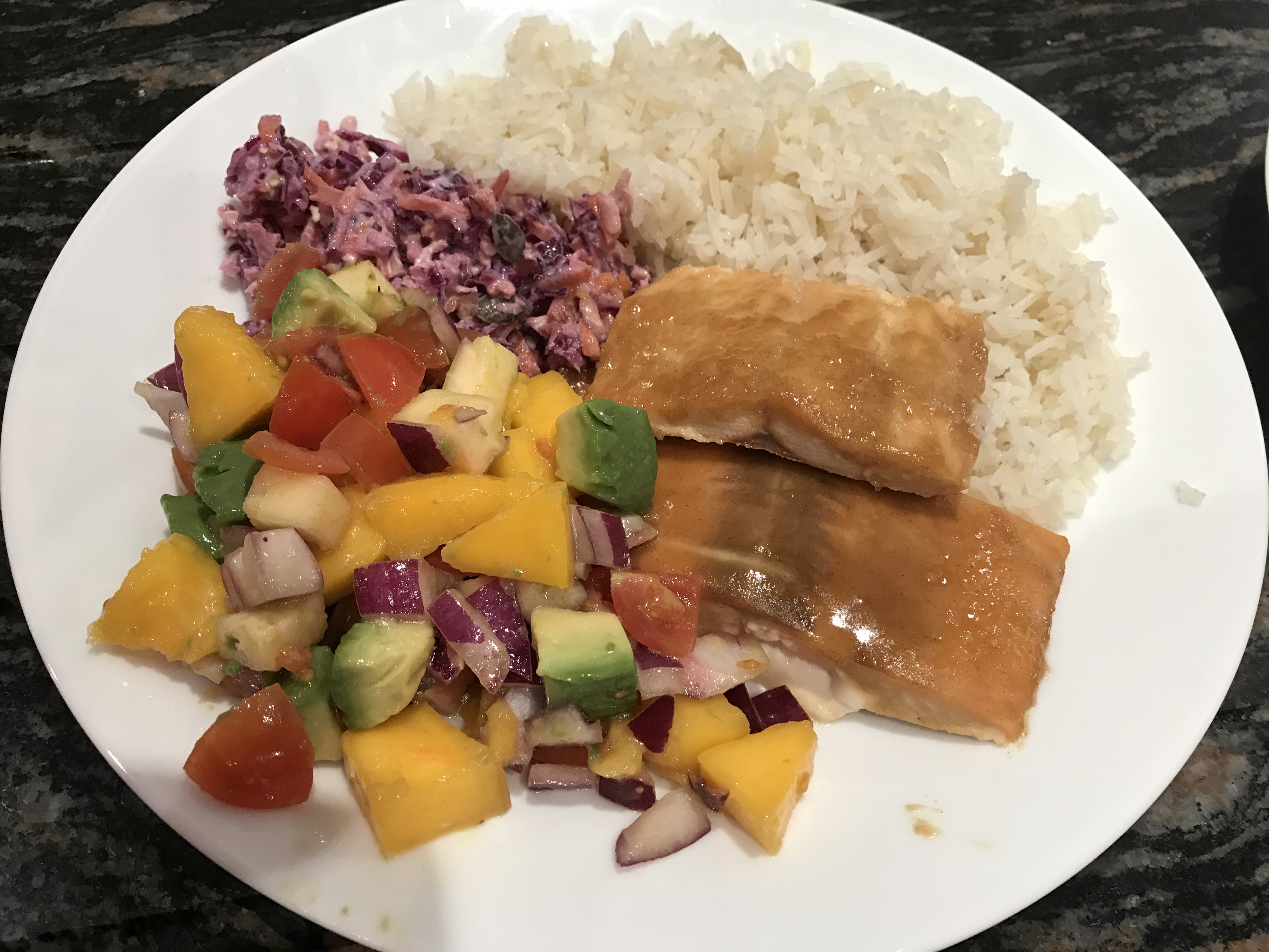 I had a day recently with nothing planned for dinner, but I knew I had some leftover salsa and coleslaw in the fridge, and some coconut rice in the freezer and decided this would go beautifully with some salmon which I also keep a good stock of frozen as we try to eat fish at least twice a week.